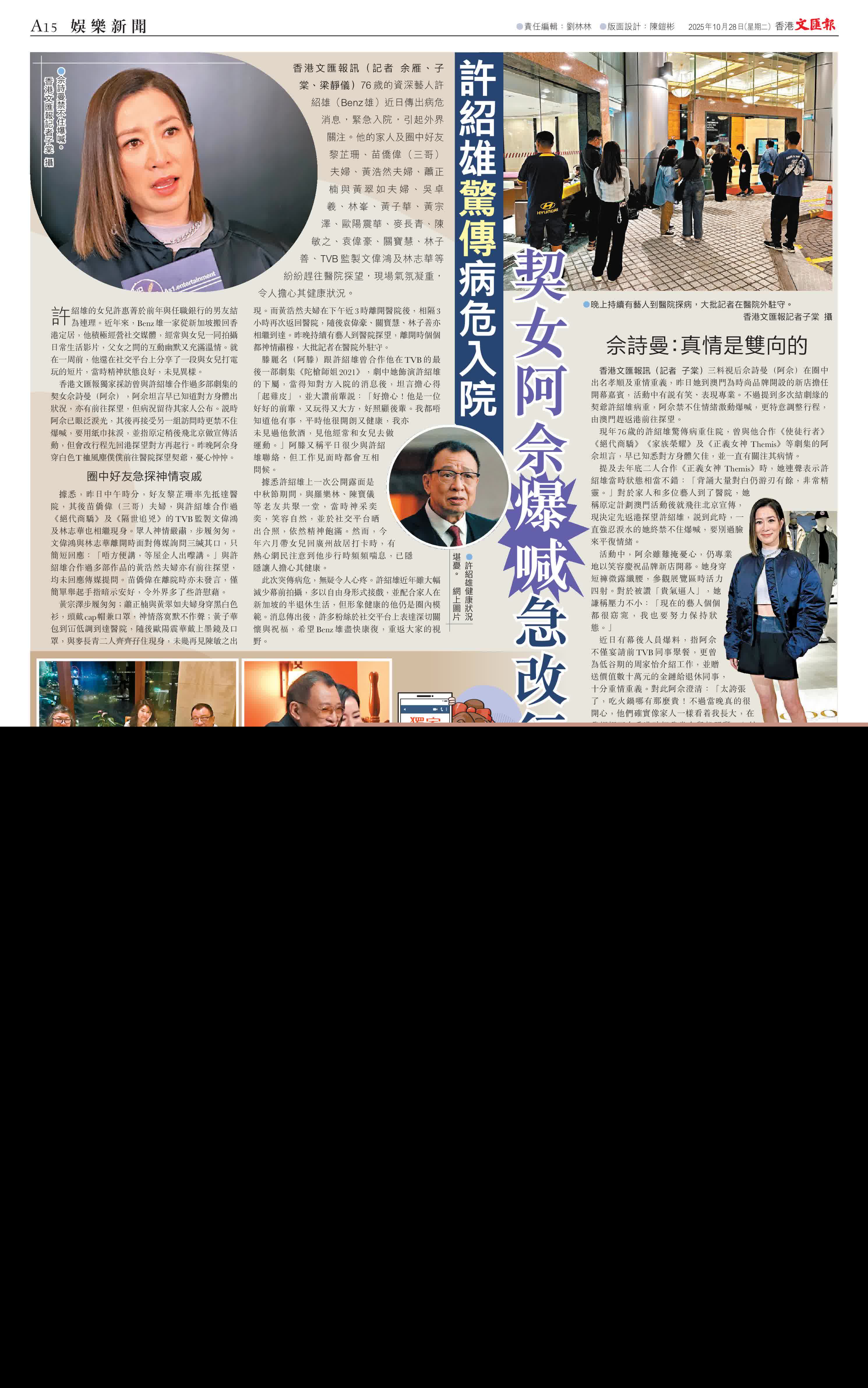 香港文匯報獨家採訪曾與許紹雄合作過多部劇集的契女佘詩曼(阿佘),阿佘坦言早已知道對方身體出狀況,亦有前往探望,但病況留待其家人公布。說時阿佘已眼泛淚光,其後再接受另一組訪問時更禁不住爆喊,要用紙巾抹淚,並指原定稍後飛北京做宣傳活動,但會改行程先回港探望對方再起行。昨晚阿佘身穿白色T裇風塵僕僕前往醫院探望契爺,憂心忡忡。