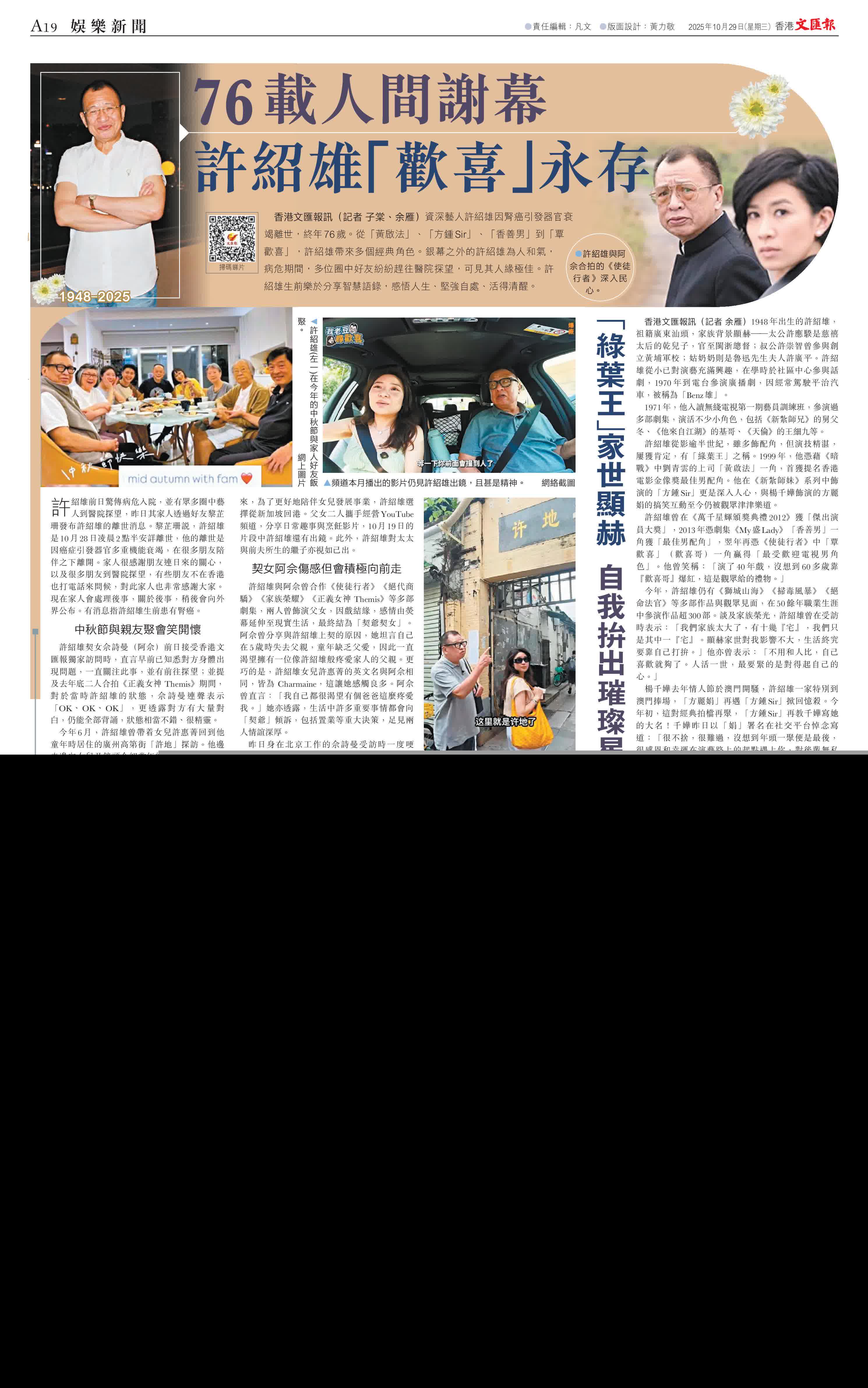香港文匯報訊(記者 子棠、余雁)資深藝人許紹雄因腎癌引發器官衰竭離世,終年76歲。從「黃啟法」、「方鍾Sir」、「香善男」到「覃歡喜」,許紹雄帶來多個經典角色。銀幕之外的許紹雄為人和氣,病危期間,多位圈中好友紛紛趕往醫院探望,可見其人緣極佳。許紹雄生前樂於分享智慧語錄,感悟人生、堅強自處、活得清醒。