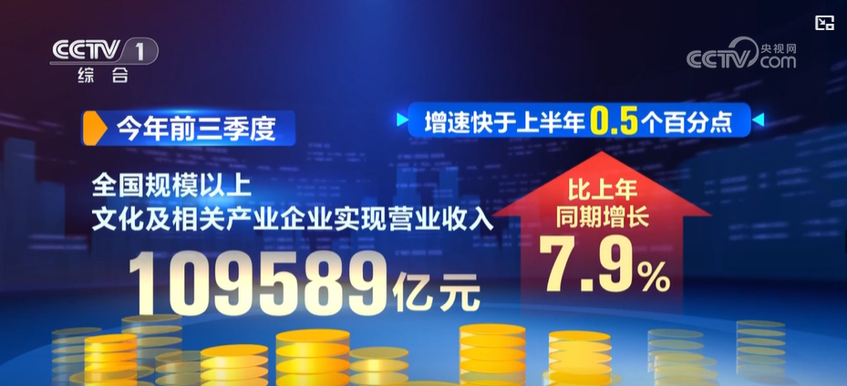 国家统计局10月30日发布的数据显示,今年前三季度,全国规模以上文化及相关产业企业实现营业收入109589亿元,比上年同期增长7.9%,增速快于上半年0.5个百分点;实现利润总额9093亿元,比上年同期增长14.2%,利润总额稳步增长。