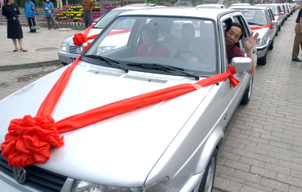 2003年7月12日,一汽-大众员工邬海旭高兴地开着新购买的轿车回家。