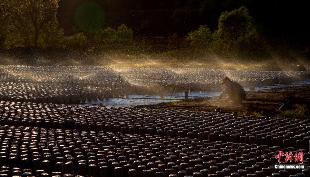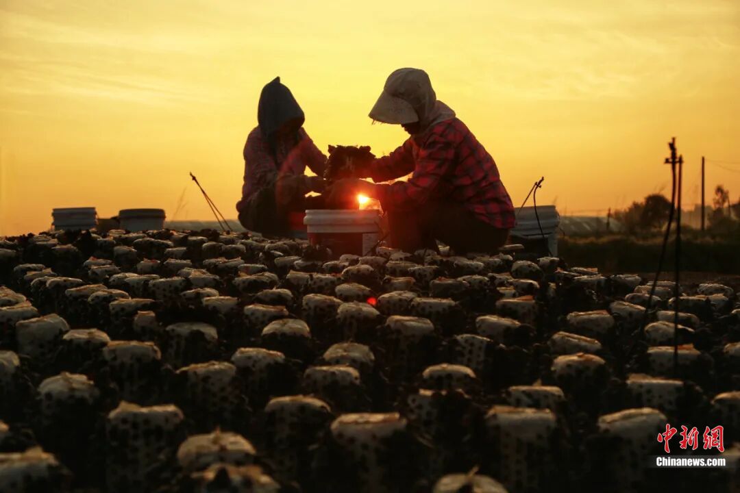 (夕阳下,菌农们正在采摘。黄松甸镇供图)