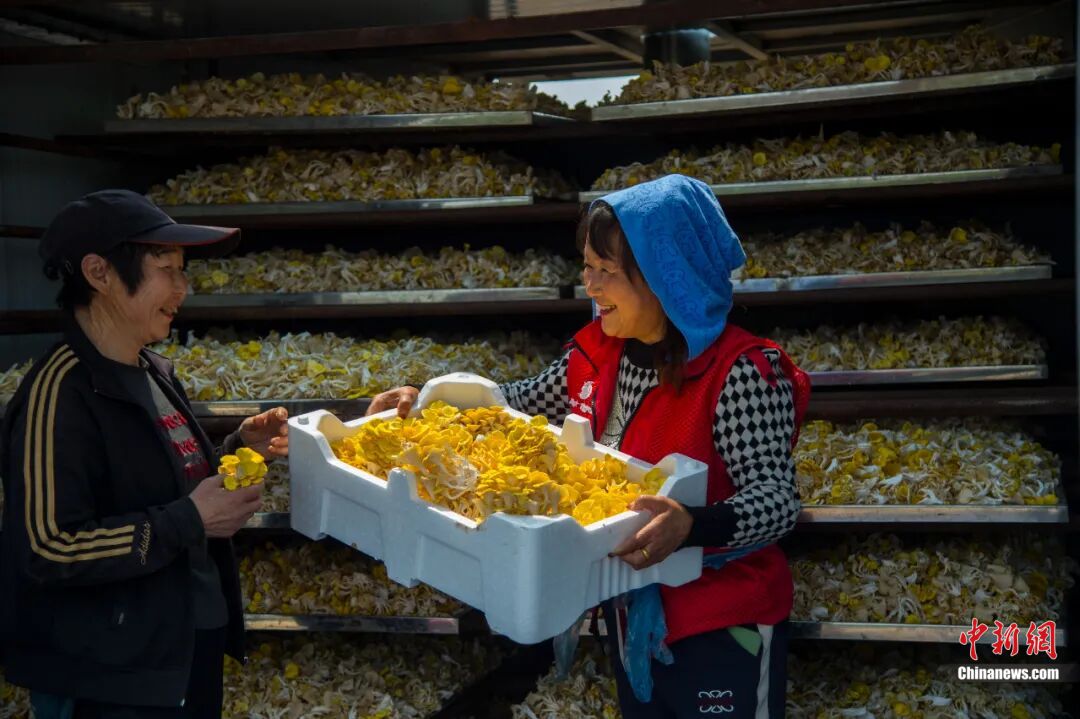 (菌菇烘干房内,菌农正在劳作。黄松甸镇供图)