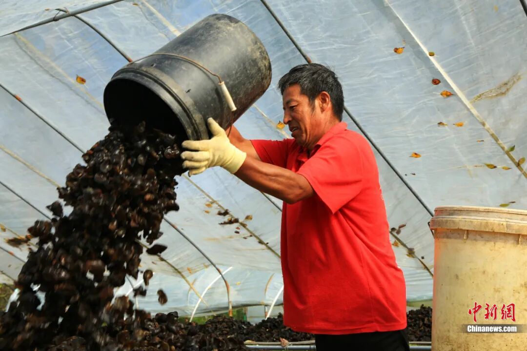 (菌农将采摘下来的黑木耳倒出。黄松甸镇供图)