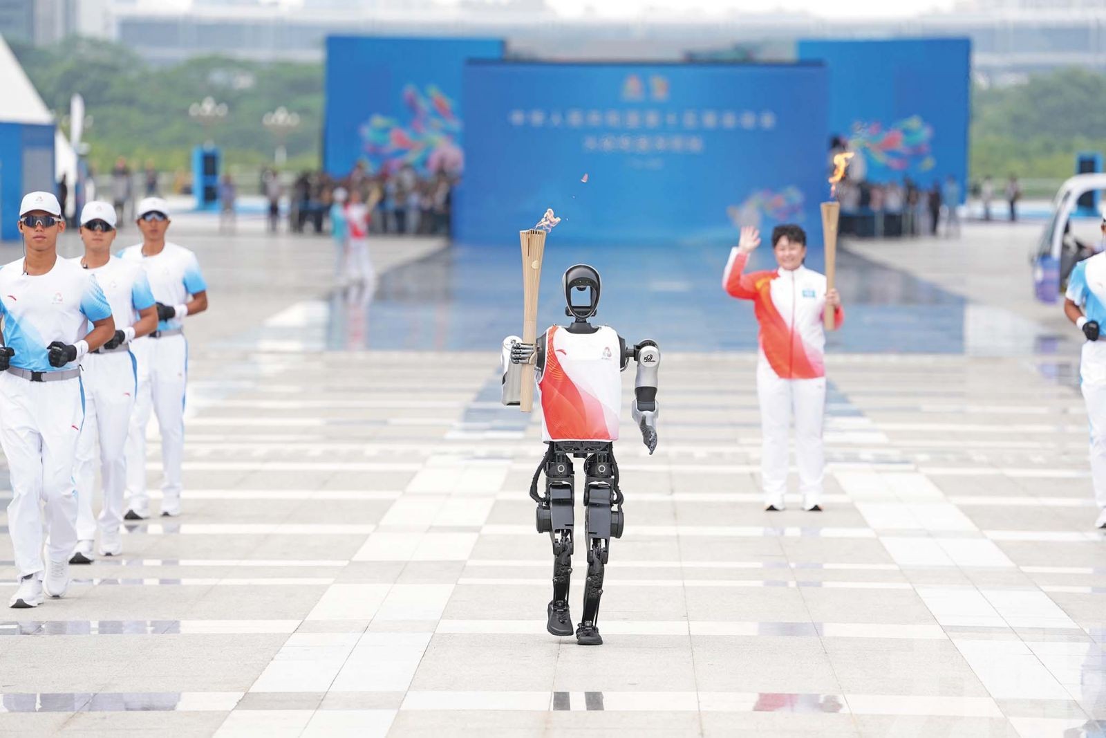 火炬手人形機器人 「夸父」 在深圳站傳遞火炬。(新華社圖片)