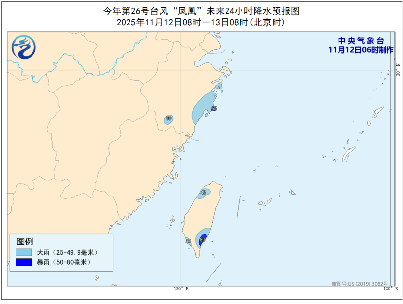 降水预报:12日08时到13日08时,浙江东部、台湾岛北部和南部将有大到暴雨(50-80毫米)。