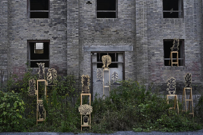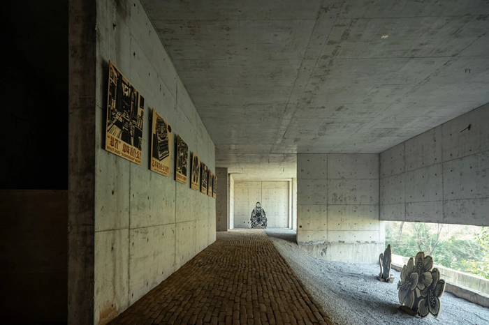 清水混凝土建筑内正在展出刘庆元的《游记木刻》与孙彦初的《显山绘影》两个展览。刘庆元长期行走于乡村田野,他将村民劳作、神祗与动植物形象以快速而精确的刀法一一刻出,生动而朴拙。刘庆元创作的动物、昆虫与人物木刻被分置于清水混凝土建筑的内外空间,在灰色墙面与沙砾地面的衬托下,作品体量感被放大,凝重且带有超现实的距离。户外草地上,一组花草木刻散落于荒草间,一只巨大的雄鸡木刻昂首面向村舍,自然与艺术彼此叠映,回应了他所言的“废墟美学”。