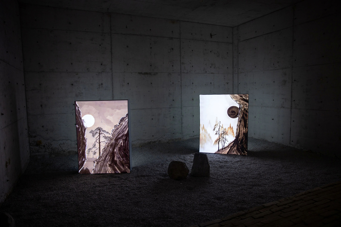 孙彦初的创作融合了绘画性与摄影暗房技术,呈现出梦幻般的图像质感。《显山绘影》系列延续了他在大南坡的驻留经历。他用显影液直接在相纸上书写山水与记忆,包括山川、月夜、松竹与飞瀑,其中部分作品来自云台山考察。孙彦初的现场作品以灯箱呈现:幽暗空间里,墙面小孔的微光与山景灯箱散出的幽辉互相呼应,营造出静谧而幽玄的观景场;在另一处开放空间,两侧墙面的“月夜“大幅风景画与正面的太行山实景相对照,形成强烈的对峙与互文。