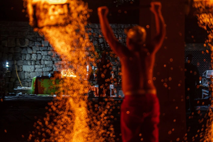 从孟泉村赶来的鼓舞队,从村外一路击鼓进入大南坡村。队伍穿街过巷,村民纷纷走出院子,节日的热闹从这一刻开始蔓延。表演者杨亦可再次上演“火壶呈祥”。 这一次他脱去防火服,赤裸上身在火光中挥舞,古老祈福的仪式伴随着观众阵阵的欢呼,把乡村节庆的热闹气氛烘托得更加火热。