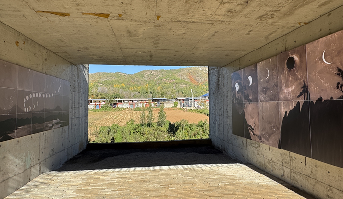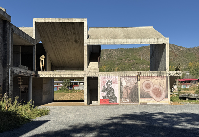 本届南坡秋兴的展览设置在美学中心。这里由原乡村礼堂、新建的清水混凝土建筑,以及礼堂对面的砖房合围成一处院落。清水混凝土建筑由建筑师梁井宇设计,因外立面尚未完工,部分内部结构、墙面、楼梯与钢筋裸露,呈现出一种直观而松弛的结构美。窗洞、隔间与楼梯的多重穿透与分隔,为作品展陈提供了丰富的空间肌理与光影层次。
