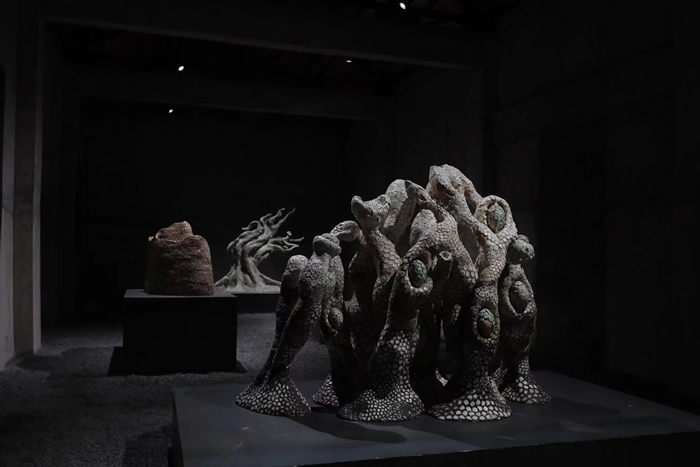 砖房内外展陈着洪张良的《从山到器——绞胎:地质与历史的再叙事》。洪张良是一位当代陶瓷艺术家,在他留学英国期间,就被原产于河南修武当阳地区的绞胎瓷工艺所深深吸引,回国后他就一直进行绞胎瓷的创作。这次他在大南坡展出的绞胎瓷形态自由扭曲,肌理丰富多变,具有非常强烈的现代感。同时绞胎瓷被重新安放回当地的地质与文化脉络中,以大南坡为原点,将千年的纹理与脚下的土壤重新连缀在一起。