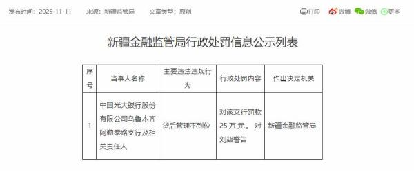 新疆金融监管局近日公布的行政处罚信息公示列表显示,中国光大银行股份有限公司乌鲁木齐阿勒泰路支行及相关责任人贷后管理不到位。新疆金融监管局对该支行罚款25万元。对刘超警告。