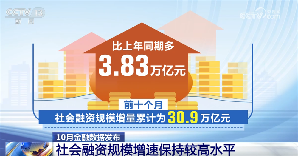 央视网消息:11月13日,中国人民银行发布10月金融数据。10月,社会融资规模增速保持在较高水平,持续为经济回升向好创造适宜的货币金融环境。
