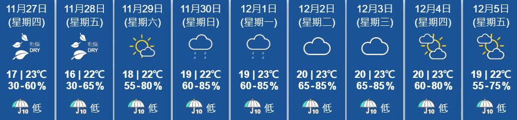 天文台表示,今晚北風逐漸增強。未來一兩日持續天晴及非常乾燥。明日北風增強,星期五早上市區氣溫下降至15至16度左右,新界再低幾度。星期六稍後漸轉多雲,隨後一兩日有一兩陣雨。