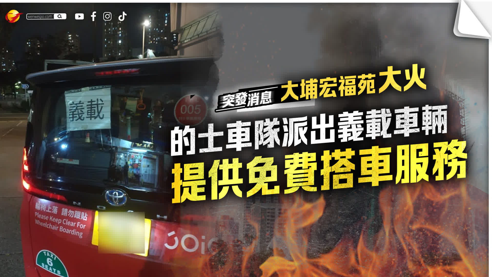 大埔宏福苑26日發生五級火警,傷亡慘重,令全港市民痛心,社會各界都設法向有需要人士提供幫助。「JOIE樂行香港」在官方Facebook賬號發文,稱義載的士已陸續抵達大埔的多個臨時庇護中心,有需要用車的人士可直接上車。
