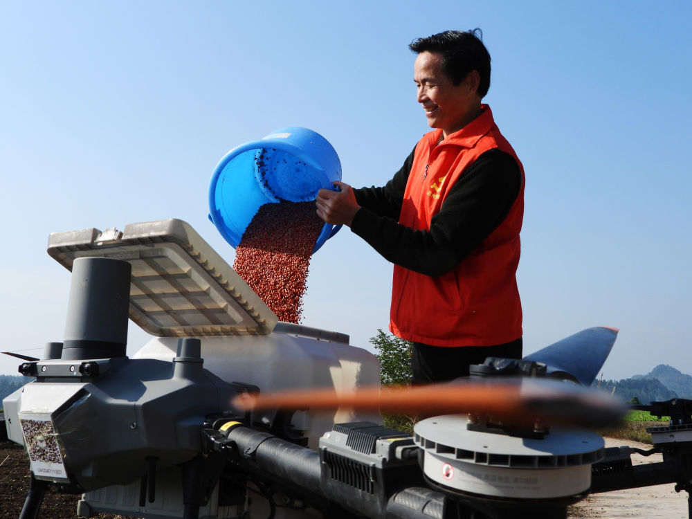 11月21日,农机手在四川省达州市渠县文崇镇谭坝社区田间给植保无人机添加小麦种子,准备进行“飞播”作业。(邓良奎 摄)