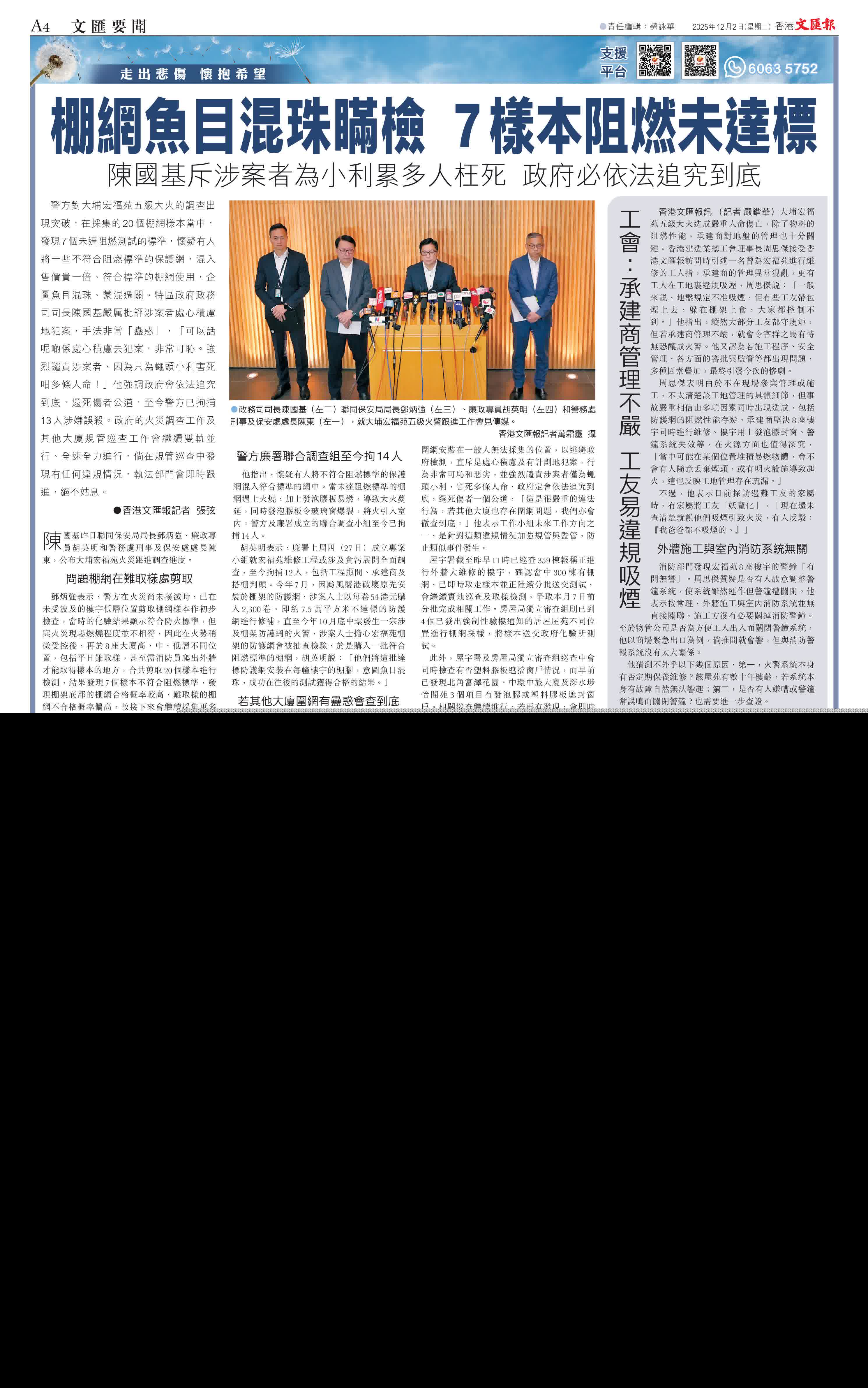 (香港文匯報記者 張弦)警方對大埔宏福苑五級大火的調查出現突破,在採集的20個棚網樣本當中,發現7個未達阻燃測試的標準,懷疑有人將一些不符合阻燃標準的保護網,混入售價貴一倍、符合標準的棚網使用,企圖魚目混珠、蒙混過關。特區政府政務司司長陳國基嚴厲批評涉案者處心積慮地犯案,手法非常「蠱惑」,「可以話呢啲係處心積慮去犯案,非常可恥。強烈譴責涉案者,因為只為蠅頭小利害死咁多條人命!」他強調政府會依法追究到底,還死傷者公道,至今警方已拘捕13人涉嫌誤殺。政府的火災調查工作及其他大廈規管巡查工作會繼續雙軌並行、全速全力進行,倘在規管巡查中發現有任何違規情況,執法部門會即時跟進,絕不姑息。