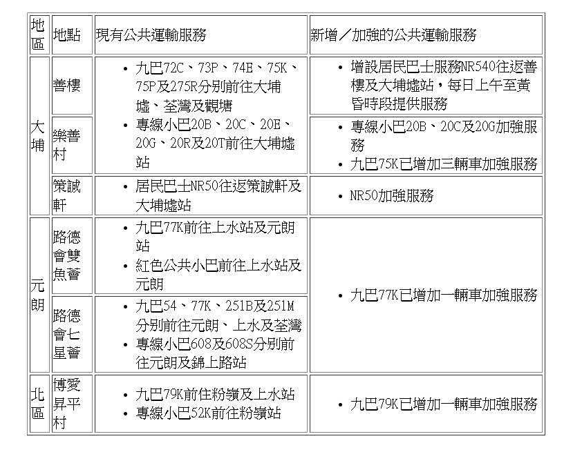 有關專營巴士及專線小巴服務詳情,可參閱運輸署網頁及各專營巴士營辦商網頁。運輸署會繼續與相關過渡性房屋項目營運機構和公共運輸服務營辦商緊密協調,照顧居民的出行需要。