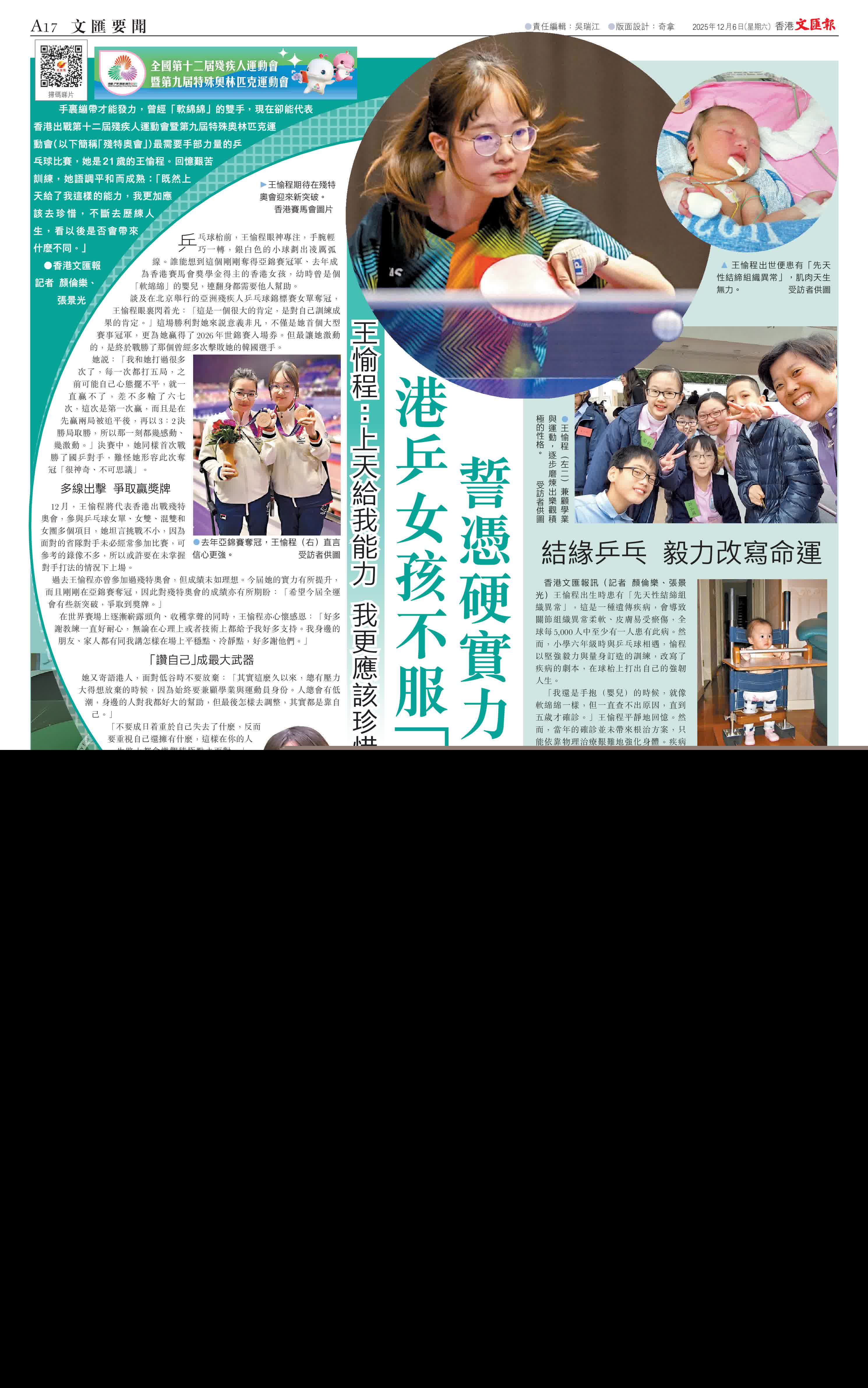 (香港文匯報記者 顏倫樂、張景光)王愉程出生時患有「先天性結締組織異常」,這是一種遺傳疾病,會導致關節組織異常柔軟、皮膚易受瘀傷,全球每5,000人中至少有一人患有此病。然而,小學六年級時與乒乓球相遇,愉程以堅強毅力與量身訂造的訓練,改寫了疾病的劇本,在球枱上打出自己的強韌人生。
