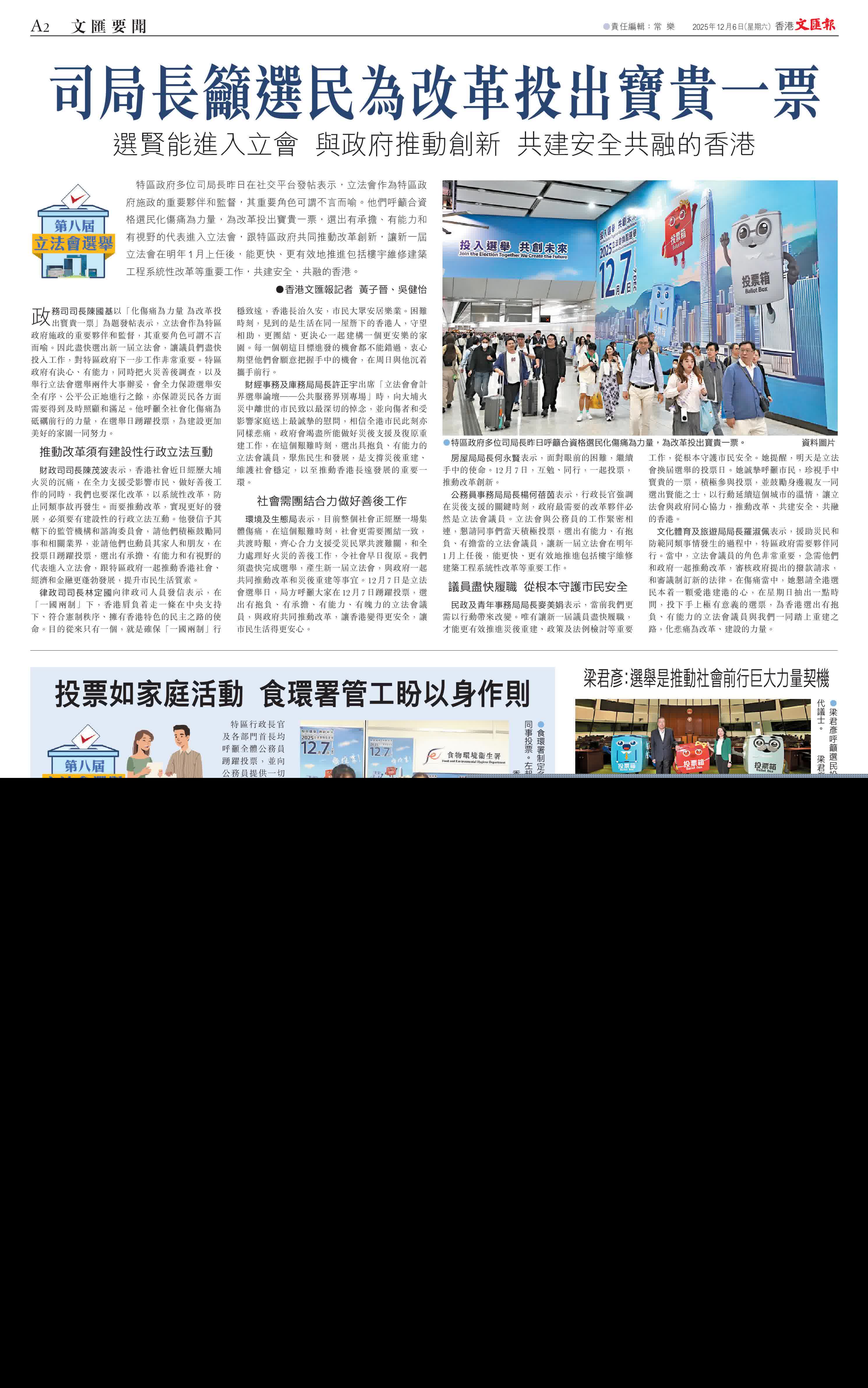 (香港文匯報記者 黃子晉、吳健怡)特區政府多位司局長昨日在社交平台發帖表示,立法會作為特區政府施政的重要夥伴和監督,其重要角色可謂不言而喻。他們呼籲合資格選民化傷痛為力量,為改革投出寶貴一票,選出有承擔、有能力和有視野的代表進入立法會,跟特區政府共同推動改革創新,讓新一屆立法會在明年1月上任後,能更快、更有效地推進包括樓宇維修建築工程系統性改革等重要工作,共建安全、共融的香港。