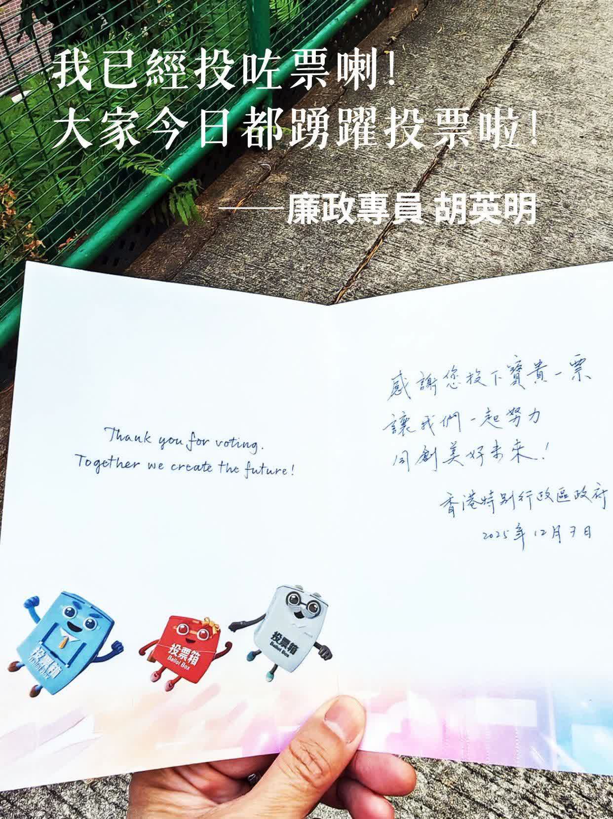 香港文匯報訊(記者 蕭景源)第八屆立法會換屆選舉今日(7日)舉行投票,是香港市民行使公民權利、塑造香港未來的關鍵時刻,大家應該踴躍投票。廉政公署facebook專頁帖文,廉政專員胡英明已履行公民責任投票,他呼籲「我投咗票喇!你哋都要踴躍投票,一齊選出有抱負、有能力、有擔當嘅立法會議員,同創美好嘅未來」。