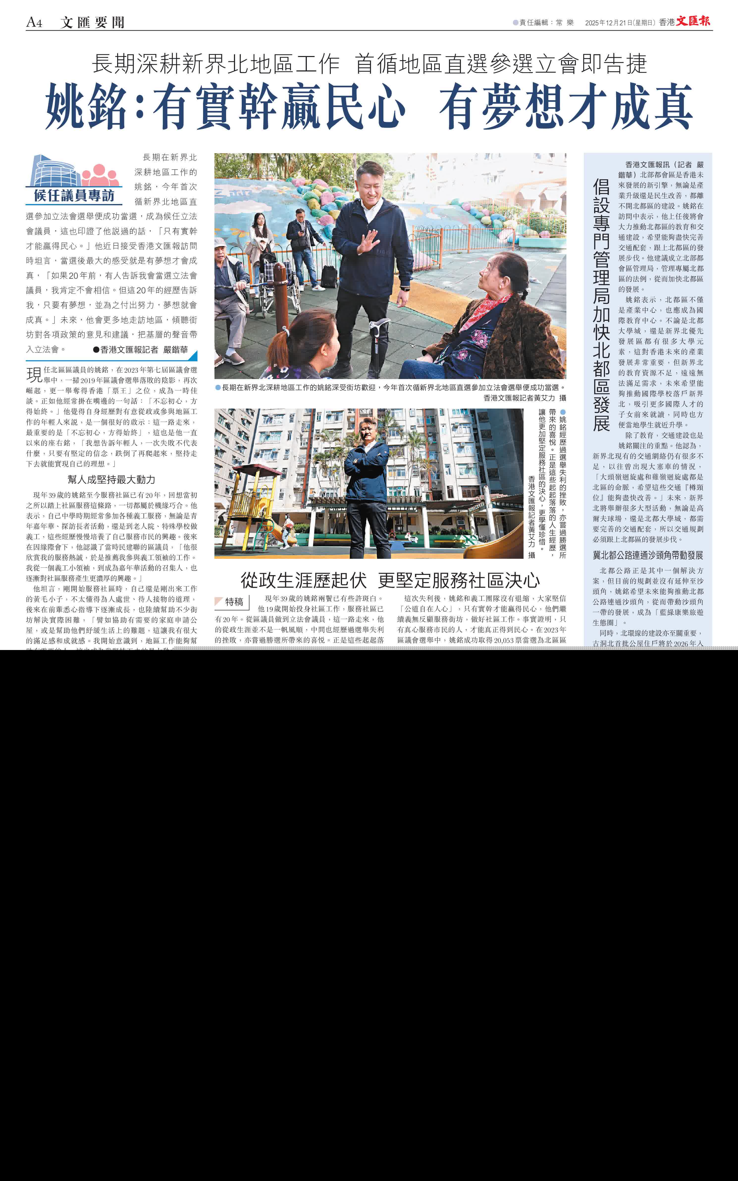這20年間,姚銘從最初從政的青澀期慢慢走向如今的成熟期,其間也經歷過很多事情。尤其是今次選舉期間,不幸發生大埔宏福苑五級火災。他認真聆聽了街坊和長者提出的不同訴求,也相信只要特區政府秉持以人為本的原則,認真傾聽民意,一定能夠找到解決方案。