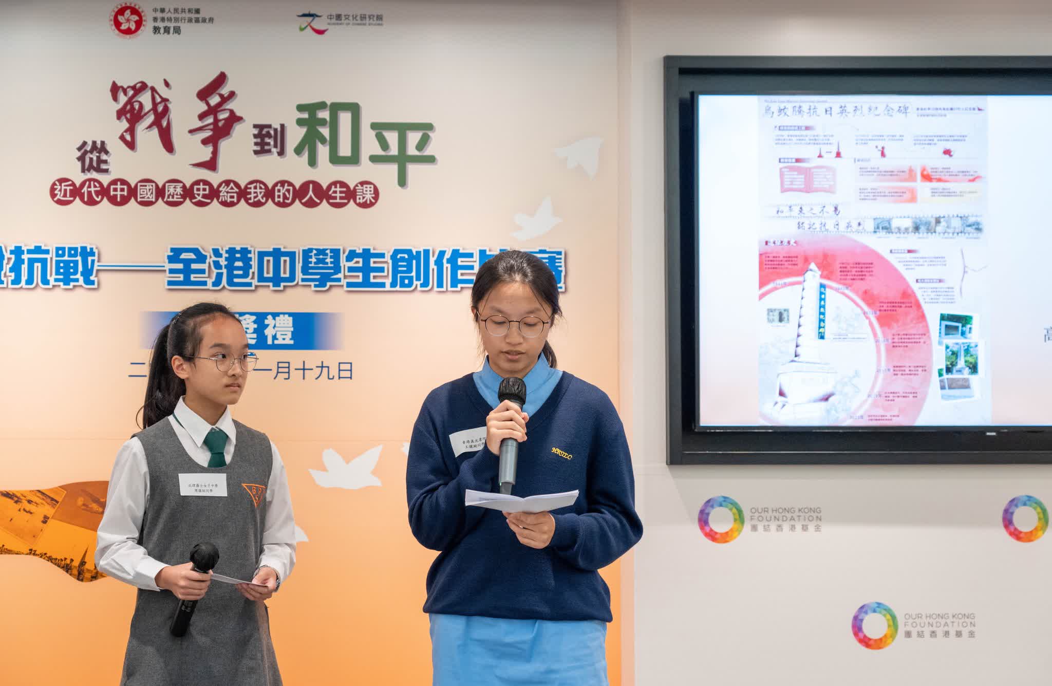 香港文匯報訊(記者高鈺)為紀念抗戰勝利八十周年,教育局聯同中國文化研究院舉辦「從戰爭到和平﹕近代中國歷史給我的人生課」學與教系列活動,包括「畫說抗戰——全港中學生創作比賽」,近60間學校,超過2,700名學生參加。初中組以跨越時空對話形式進行漫畫創作,傳遞以史為鑑,珍視和平的訊息;高中組則以資訊圖表介紹香港抗戰遺址,生動詮釋香港在國家抗戰全局中不可或缺的獨特角色。