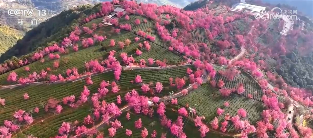在低纬度、高海拔的特殊气候中,无量山樱花谷的这些樱花形成了在冬季开花的独特生物钟。茶与樱从此相伴相生,茶树为樱花提供了滋养,樱花为茶园增添了景观,这种生态组合造就了眼前这幅“茶绿樱粉”的美丽画卷。
