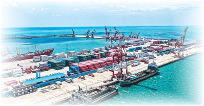 在山东省荣成市石岛新港口岸,满载跨境电商货物的外籍货轮在进行集装箱装卸作业。