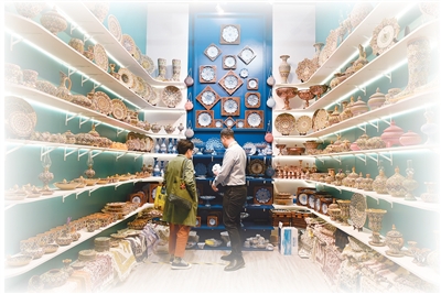 第八届进博会消费品展区,客商正在参观来自伊朗的陶瓷制品。