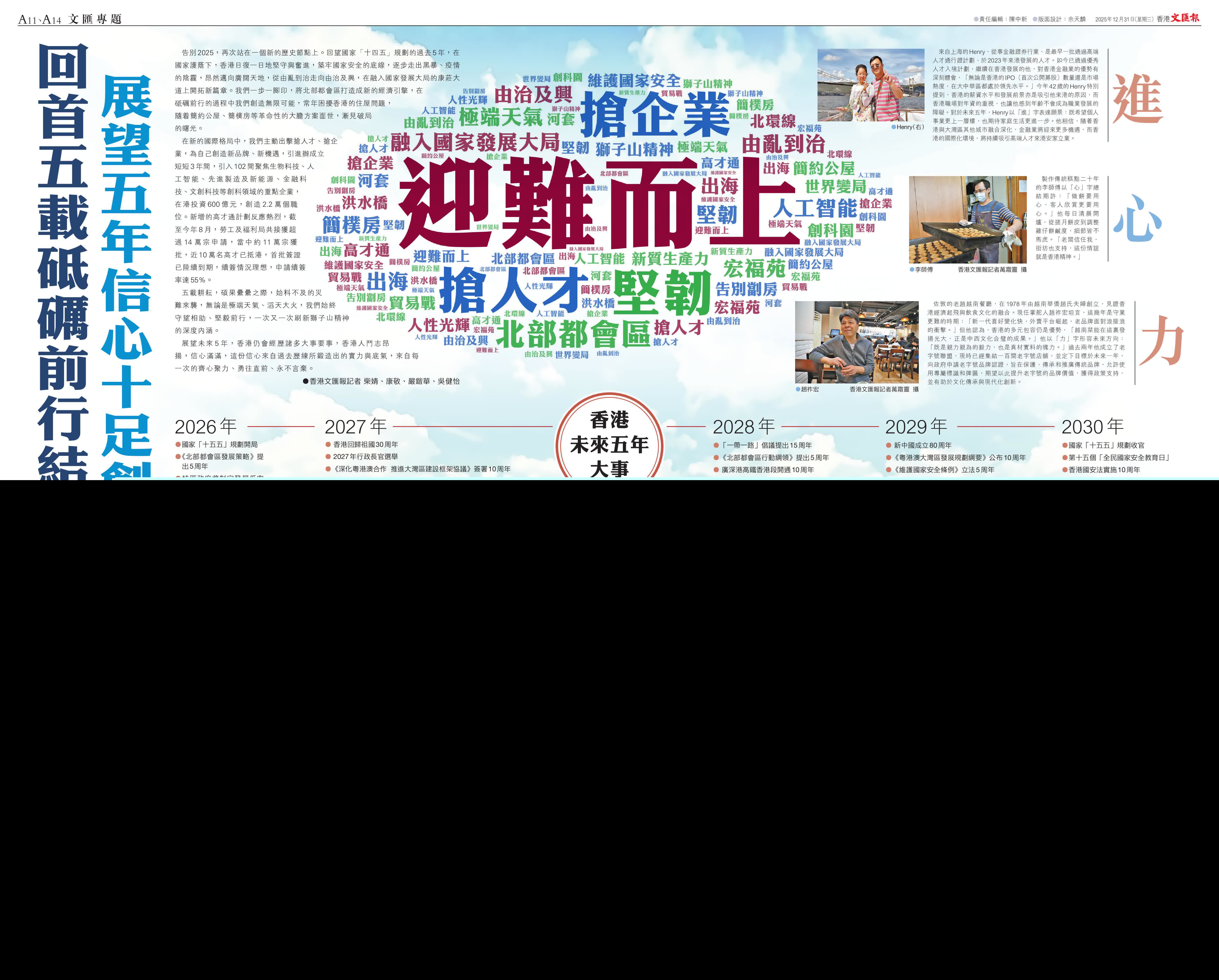 (香港文匯報記者 柴婧、康敬、嚴鍇華、吳健怡)告別2025,再次站在一個新的歷史節點上。回望國家「十四五」規劃的過去5年,在國家護蔭下,香港日復一日地堅守與奮進,築牢國家安全的底線,逐步走出黑暴、疫情的陰霾,昂然邁向廣闊天地,從由亂到治走向由治及興,在融入國家發展大局的康莊大道上開拓新篇章。我們一步一腳印,將北部都會區打造成新的經濟引擎,在砥礪前行的過程中我們創造無限可能,常年困擾香港的住屋問題,隨着簡約公屋、簡樸房等革命性的大膽方案面世,漸見破局的曙光。