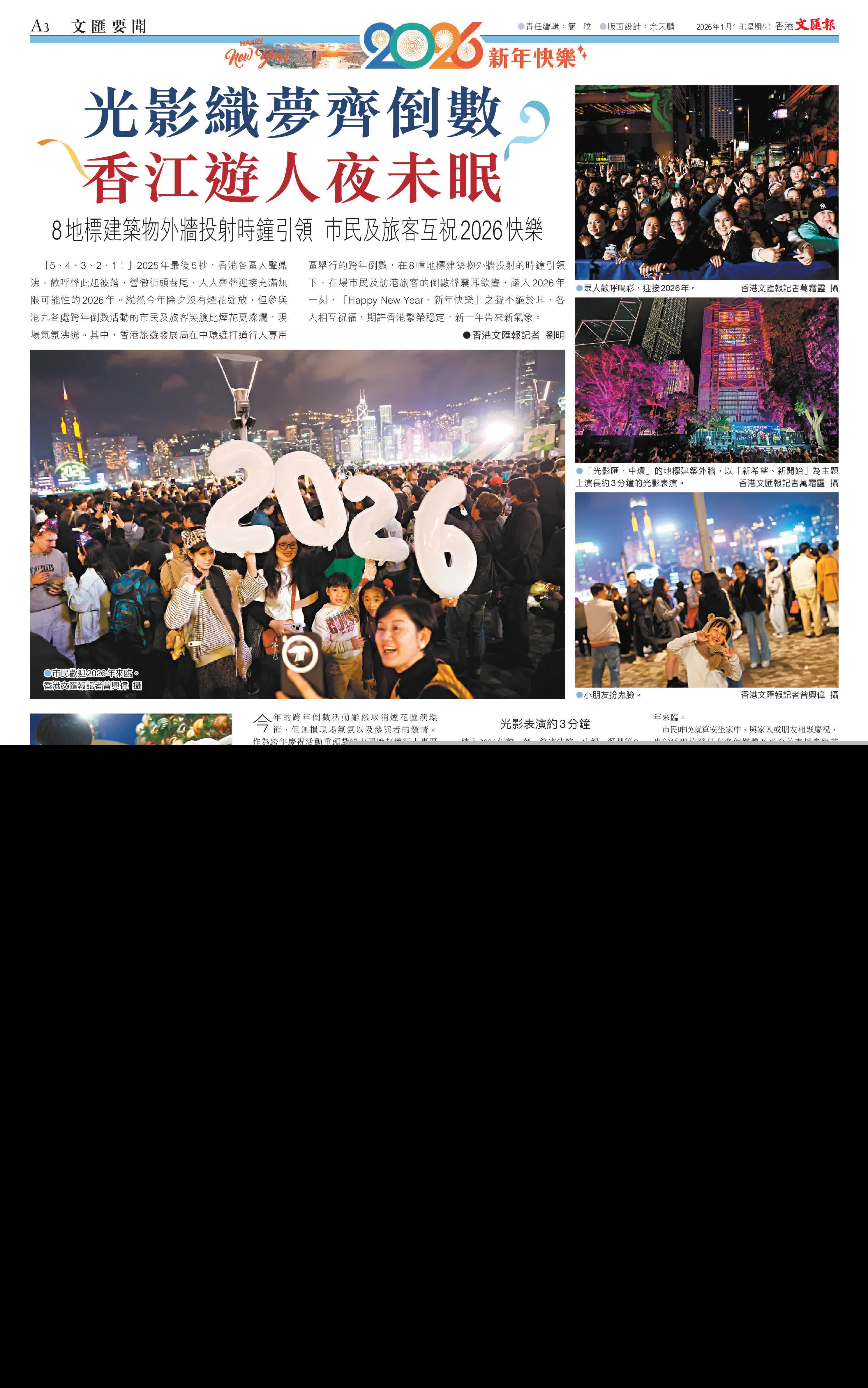 (香港文匯報記者 劉明)「5、4、3、2、1!」2025年最後5秒,香港各區人聲鼎沸、歡呼聲此起彼落,響徹街頭巷尾,人人齊聲迎接充滿無限可能性的2026年。縱然今年除夕沒有煙花綻放,但參與港九各處跨年倒數活動的市民及旅客笑臉比煙花更燦爛,現場氣氛沸騰。其中,香港旅遊發展局在中環遮打道行人專用區舉行的跨年倒數,在8幢地標建築物外牆投射的時鐘引領下,在場巿民及訪港旅客的倒數聲震耳欲聾,踏入2026年一刻,「Happy New Year、新年快樂」之聲不絕於耳,各人相互祝福,期許香港繁榮穩定,新一年帶來新氣象。