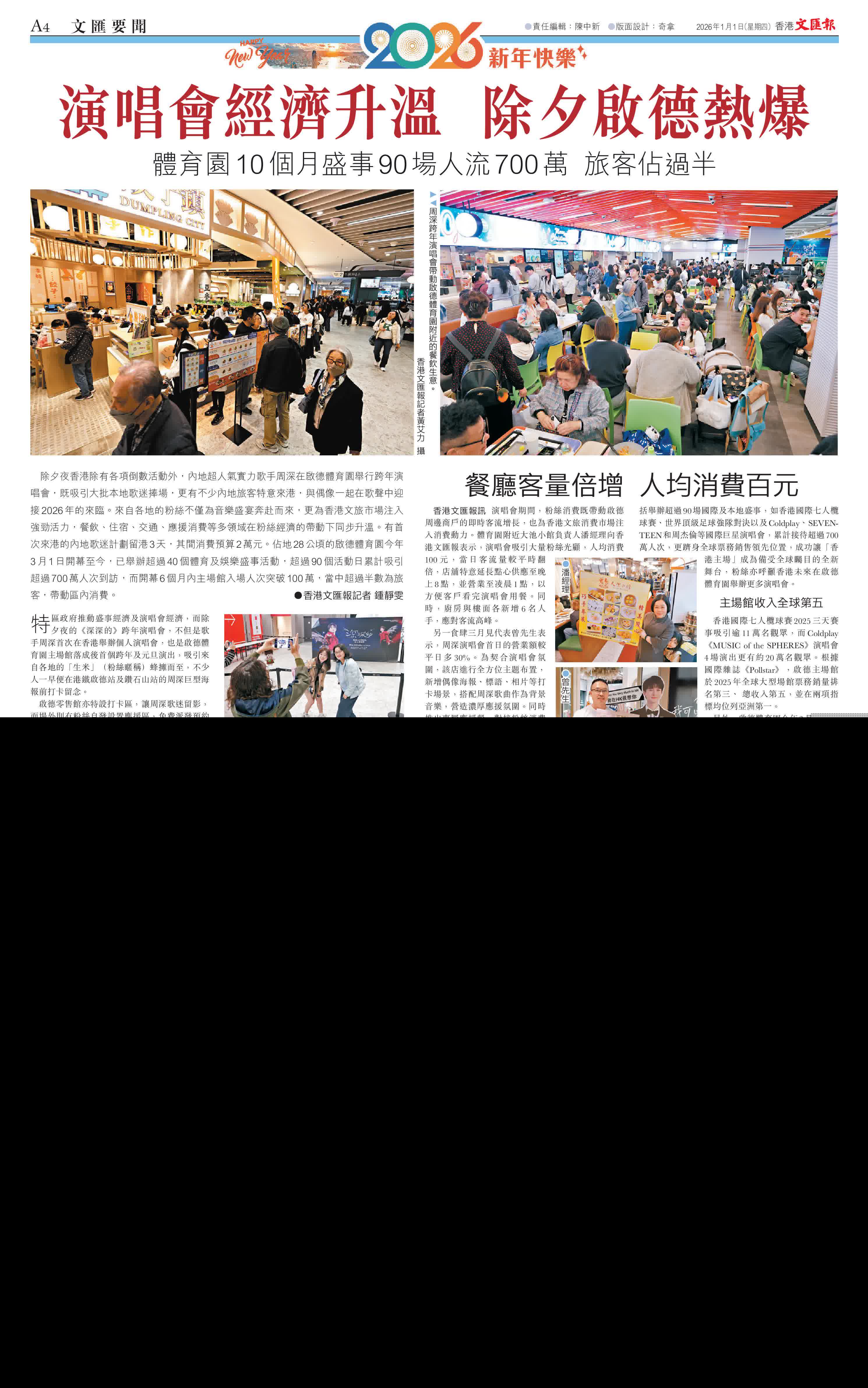 巿民昨晚就算安坐家中,與家人或朋友相聚慶祝,也能透過旅發局在多個媒體及平台的直播參與其中,旅發局更透過衛星同步向全球轉播現場盛況,與身處世界各地的觀眾一同倒數,迎接2026年。