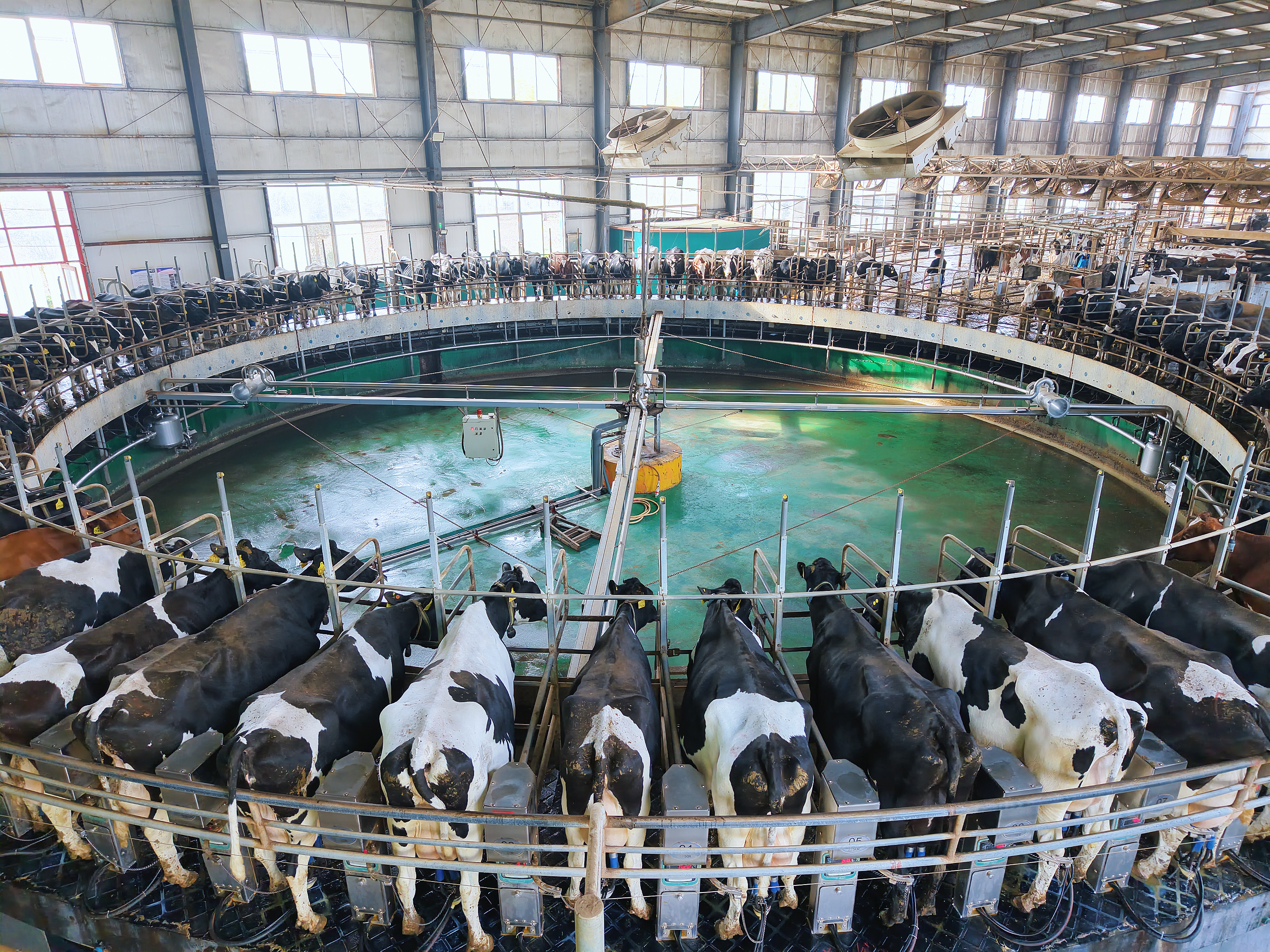 在青岛博宇牧业的智慧奶厅,80位转盘式挤奶机正缓缓转动,宛如一座精密运转的“乳业时钟”。80头荷斯坦奶牛有序站定,颈间的智能项圈与挤奶机传感系统精准对接,准确识别每一头挤奶牛;挤奶机的智能控制系统根据挤奶情况和设备运行状态自动调节和优化挤奶过程;乳成分在线监测装置实时捕捉乳蛋白、乳脂肪及电导率数据,450~500头/小时的挤奶效率,让千头规模的牧场从容应对每日挤奶任务。