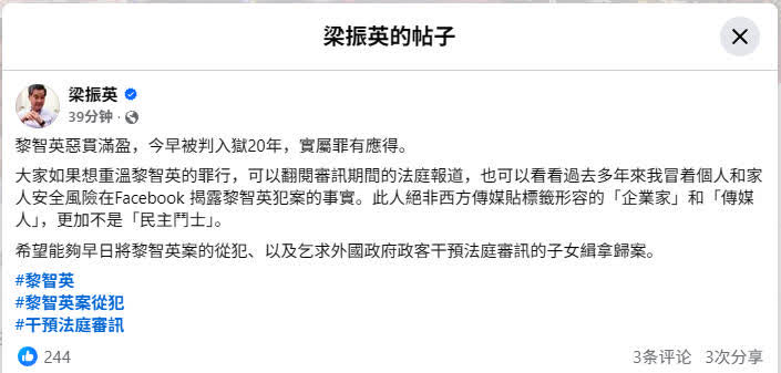梁振英:黎智英惡貫滿盈 罪有應得