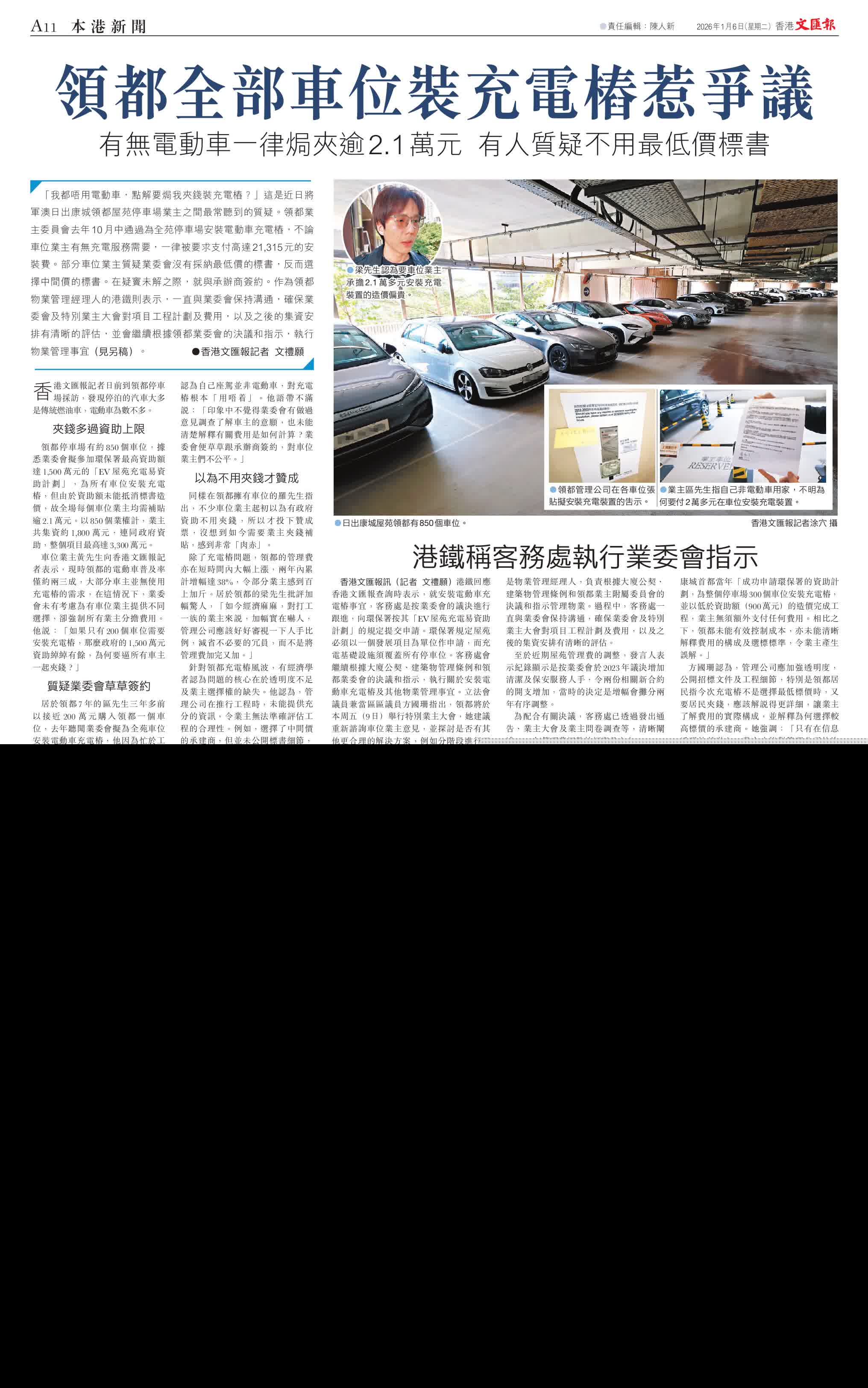 車位業主黃先生向香港文匯報記者表示,現時領都的電動車普及率僅約兩三成,大部分車主並無使用充電樁的需求,在這情況下,業委會未有考慮為有車位業主提供不同選擇,卻強制所有業主分擔費用。他說:「如果只有200個車位需要安裝充電樁,那麼政府的1,500萬元資助綽綽有餘,為何要逼所有車主一起夾錢?」