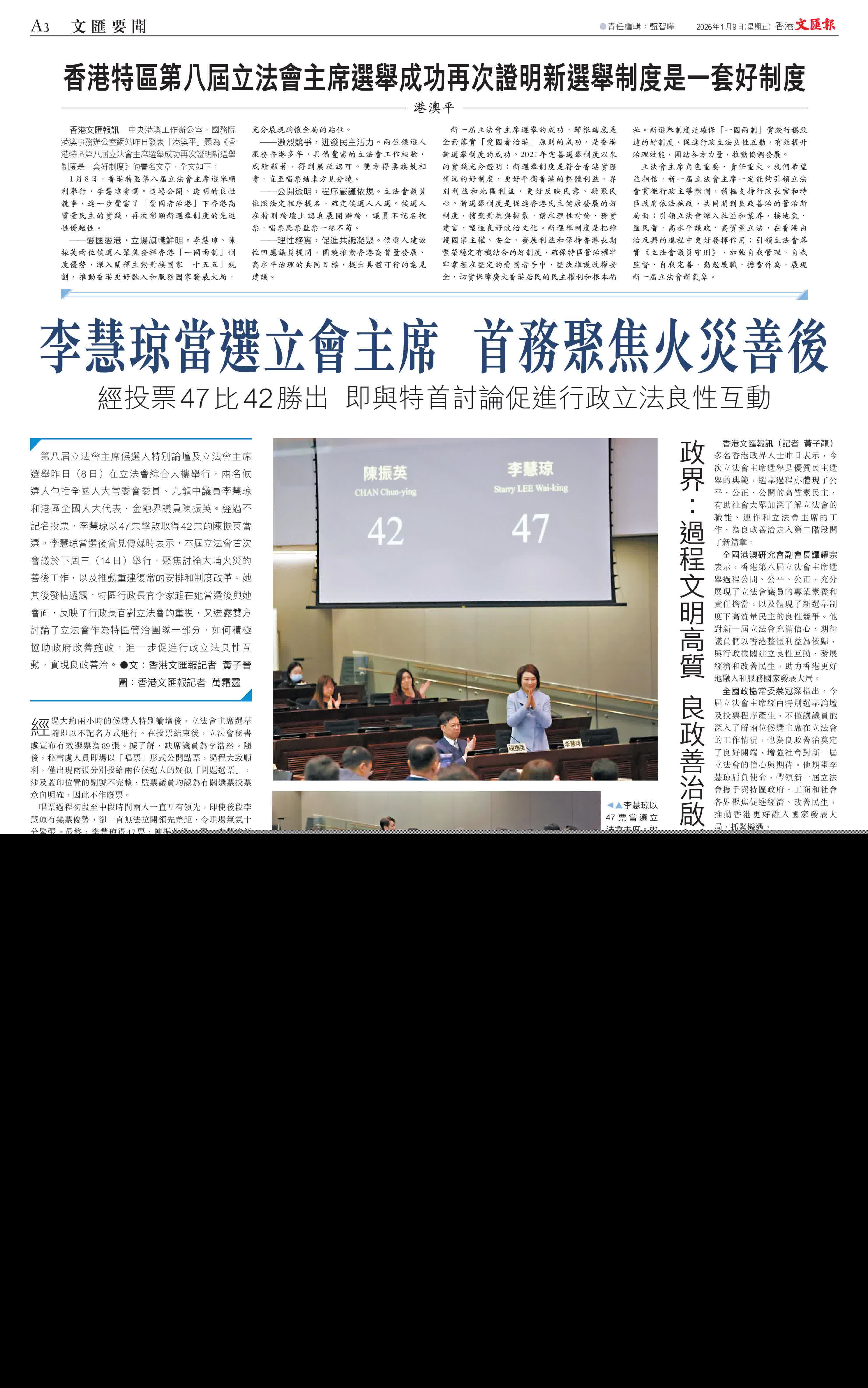 (香港文匯報記者 黃子晉)第八屆立法會主席候選人特別論壇及立法會主席選舉昨日(8日)在立法會綜合大樓舉行,兩名候選人包括全國人大常委會委員、九龍中議員李慧琼和港區全國人大代表、金融界議員陳振英。經過不記名投票,李慧琼以47票擊敗取得42票的陳振英當選。李慧琼當選後會見傳媒時表示,本屆立法會首次會議於下周三(14日)舉行,聚焦討論大埔火災的善後工作,以及推動重建復常的安排和制度改革。她其後發帖透露,特區行政長官李家超在她當選後與她會面,反映了行政長官對立法會的重視,又透露雙方討論了立法會作為特區管治團隊一部分,如何積極協助政府改善施政,進一步促進行政立法良性互動,實現良政善治。