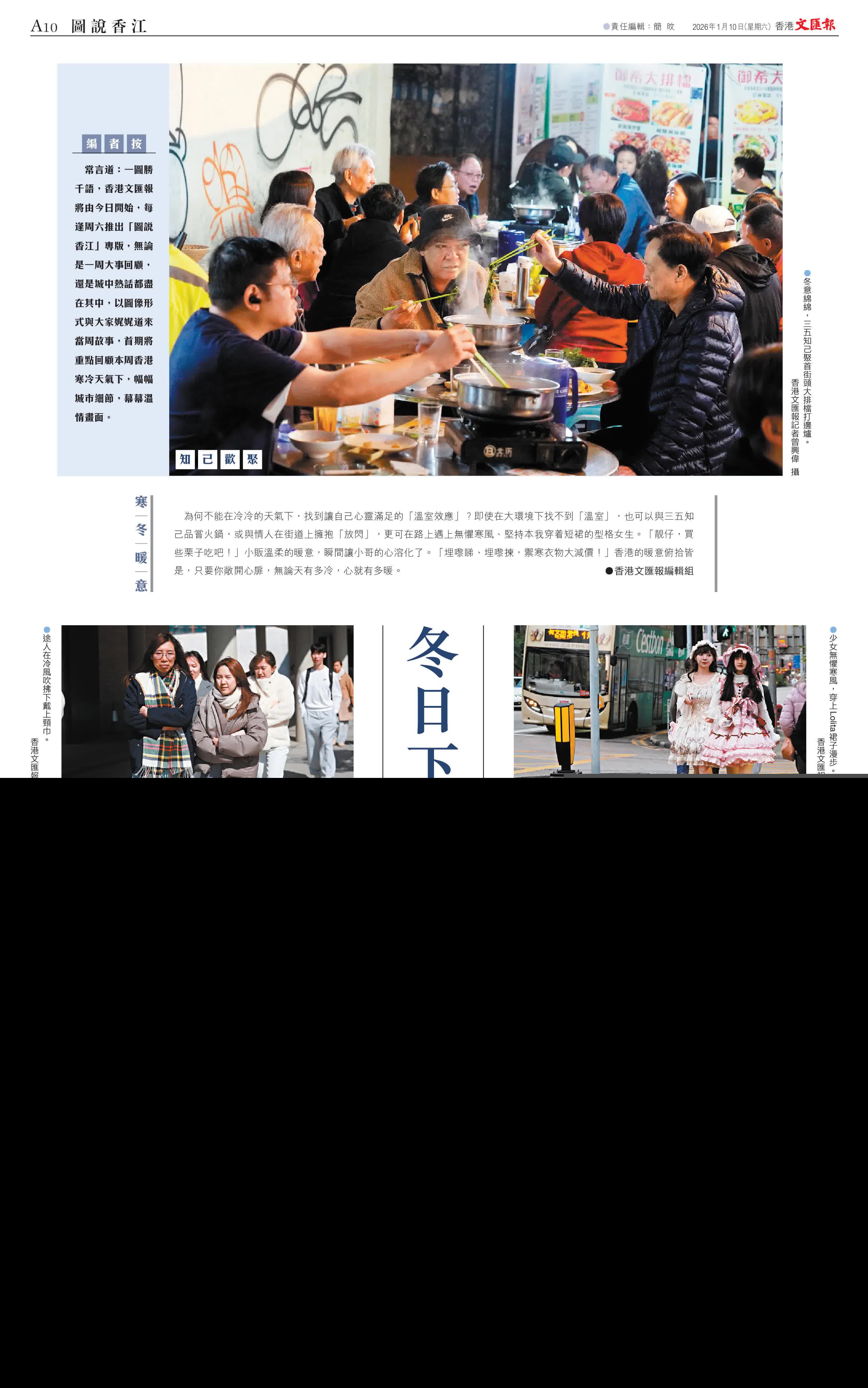 (香港文匯報編輯組)常言道:一圖勝千語,香港文匯報將由今日開始,每逢周六推出「圖說香江」專版,無論是一周大事回顧,還是城中熱話都盡在其中,以圖像形式與大家娓娓道來當周故事,首期將重點回顧本周香港寒冷天氣下,幅幅城市細節,幕幕溫情畫面。