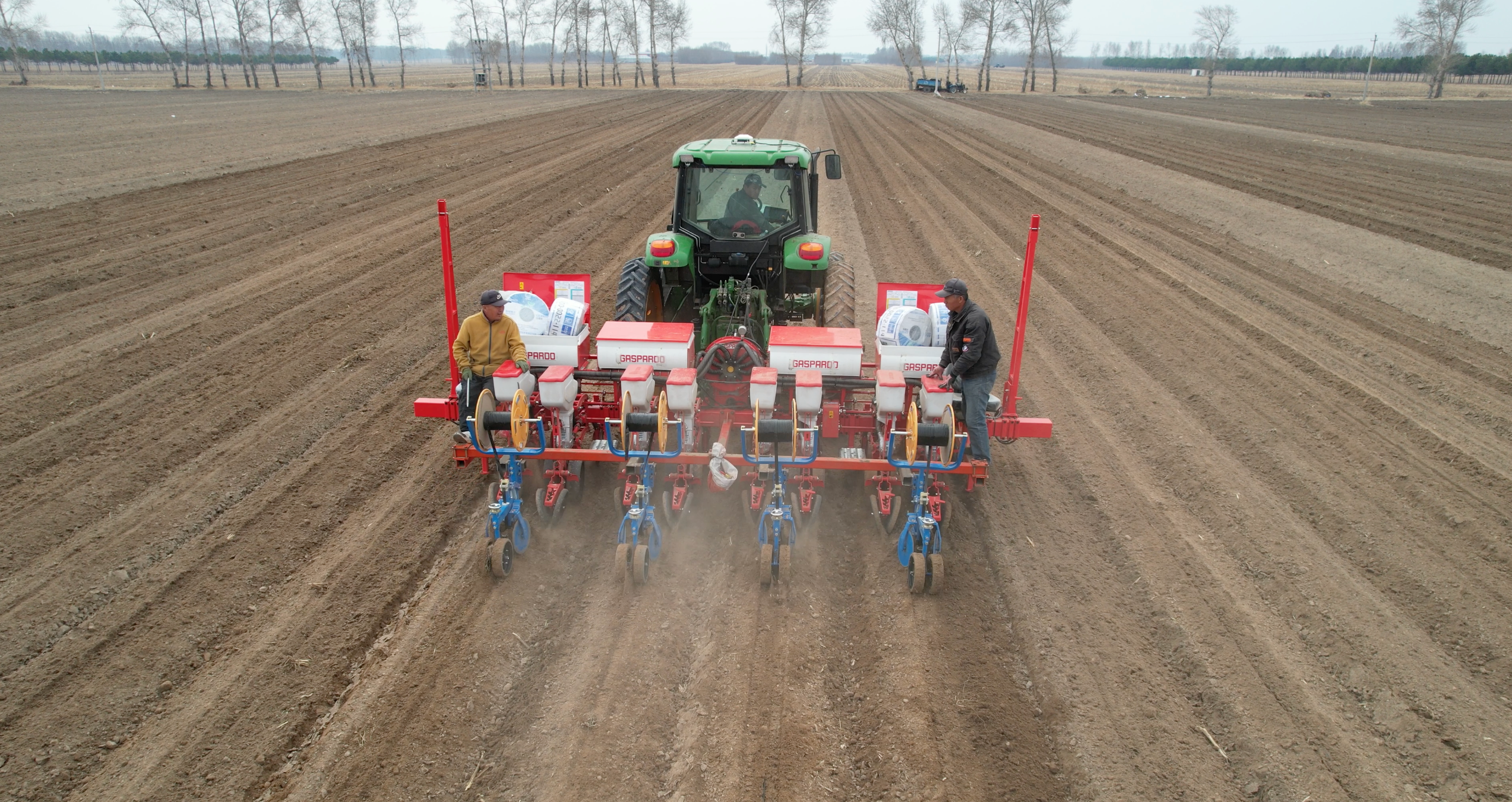 水肥一体化滴灌带铺设和播种施肥作业。