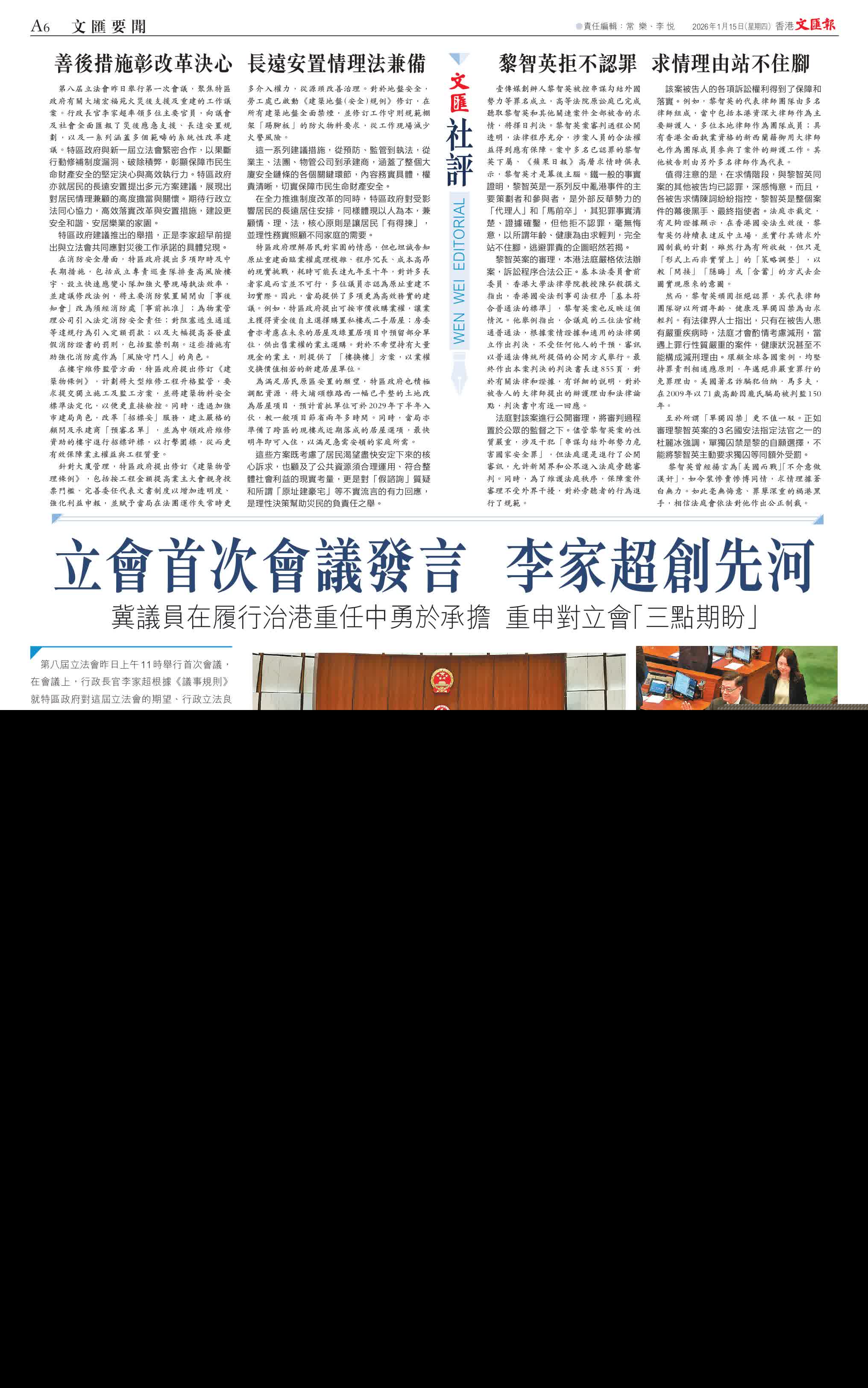 至於未來行政立法一起工作的主要「兩個方面」:第一,主動融入和服務國家發展大局,包括主動對接「十五五」規劃、更好統籌發展和安全,加快發展北部都會區,鞏固和提升香港國際競爭力等。第二,共同推動大埔宏福苑火災後的支援和重建工作,推行系統性改革,打破利益藩籬,防止悲劇再發生。