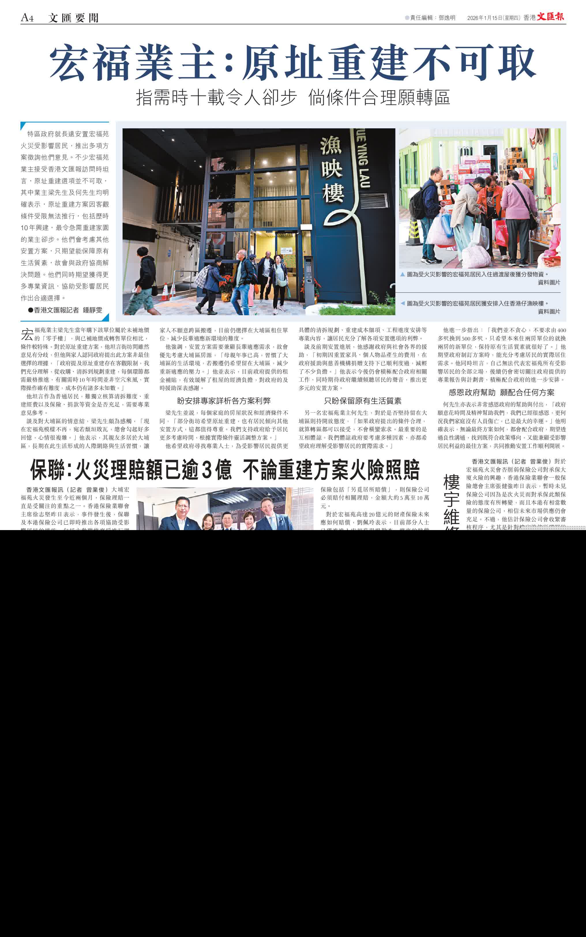 談及前期安置進展,他感謝政府與社會各界的援助,「初期因重置傢具、個人物品產生的費用,在政府援助與慈善機構捐贈支持下已順利度過,減輕了不少負擔。」他表示今後仍會積極配合政府相關工作,同時期待政府繼續傾聽居民的聲音,推出更多元的安置方案。