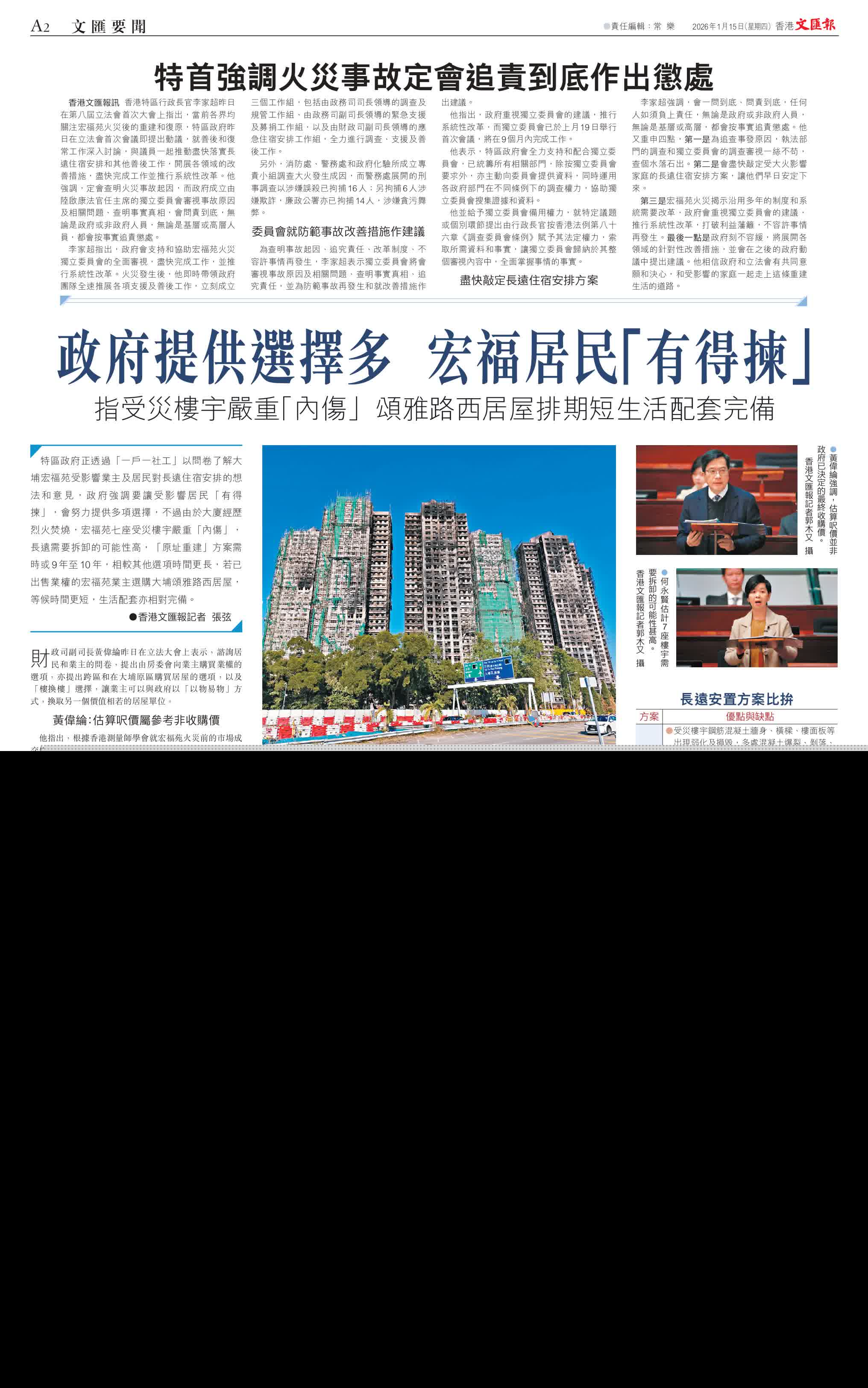 香港文匯報訊 香港特區行政長官李家超昨日在第八屆立法會首次大會上指出,當前各界均關注宏福苑火災後的重建和復原,特區政府昨日在立法會首次會議即提出動議,就善後和復常工作深入討論,與議員一起推動盡快落實長遠住宿安排和其他善後工作,開展各領域的改善措施,盡快完成工作並推行系統性改革。他強調,定會查明火災事故起因,而政府成立由陸啟康法官任主席的獨立委員會審視事故原因及相關問題、查明事實真相,會問責到底,無論是政府或非政府人員,無論是基層或高層人員,都會按事實追責懲處。