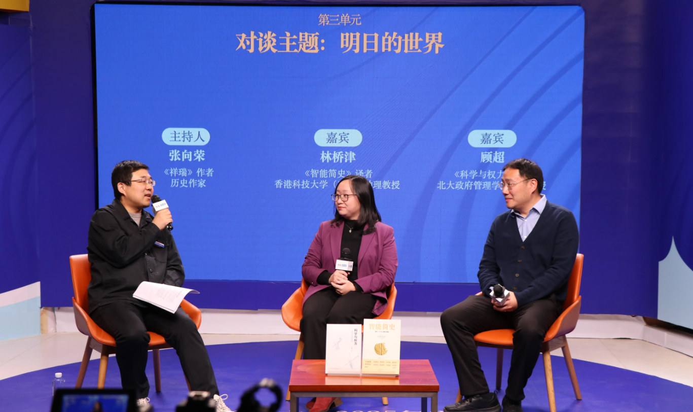 “明日的世界”单元聚焦智能技术与人文发展的关系,《科学与权力》作者顾超、《智能简史》译者林桥津的对话,及华中科技大学哲学学院教授洪亮通过视频分享的观点,均围绕科技类出版物的核心议题展开。顾超以书籍中科技与权力的关系为核心,提出科技权力已成为第五种社会权力结构,倡导AI技术“向善”赋能个体,同时强调文明演进是多元因素作用的结果,对技术保持理性态度;林桥津结合翻译实践与学术背景,指出人工翻译因人类情感与经验参与,暂时难以被AI替代,同时提出AI对教育领域的挑战与人机协同的未来趋势;洪亮则通过“数字时代的人论”文库,从多学科视角反思人的存在价值,倡导打破“人类中心主义”思维。这些探讨依托科技类出版物,既展现了当下学术研究对技术发展的思考,也反映出科技类书籍在引导公众理性看待技术、平衡人文与科技关系中的重要作用。