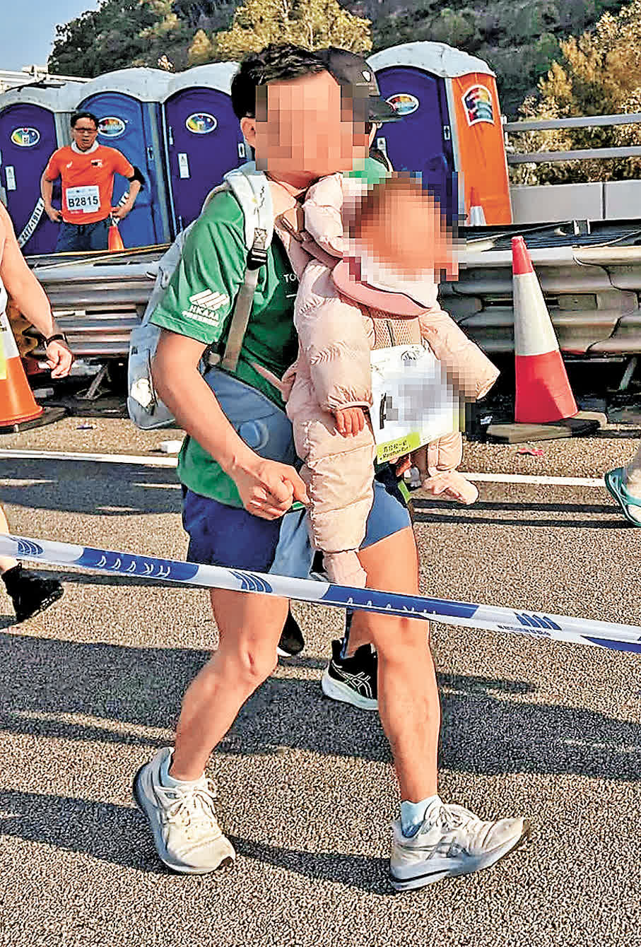 香港文匯報訊(記者 蕭景源)本周日(18日)舉行的渣打馬拉松賽事,有市民在數以萬計參賽者中,拍攝到一名「帶子洪郎」跑手。片段顯示他身後揹着背囊,身前孭着一名疑似僅數月大的嬰兒,號碼布則扣在嬰兒的防風被上。該男子當時身處西九龍公路近海盈邨,他左手托着嬰兒頸部,右手則持着電話,該嬰兒沒有哭喊,惟不少跑手經過該男子時俱轉頭回望。有關片段曝光後,旋即引來全城熱議。田徑總會回覆傳媒查詢時,證實有參賽者違規帶嬰兒參賽,並已即場要求他離開賽道,以確保安全。