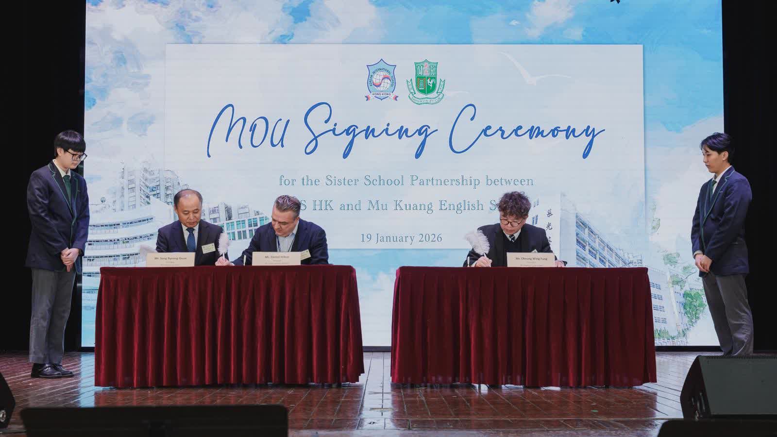 簽署儀式於下午1時45分開始,兩校校長共同簽署合作備忘錄,並進行校旗、校服及運動服交換儀式,象徵兩校友誼與合作的開始。簽署儀式後,兩校學生聯手呈獻音樂表演,包括合奏、合唱及K-Pop舞蹈,展現青年學生的藝術才華。來自韓國的婦女合唱團亦帶來多首韓文、英文及中文歌曲,彰顯文化多元,亦有跆拳道表演展現韓國傳統體育精神,贏得全場掌聲。