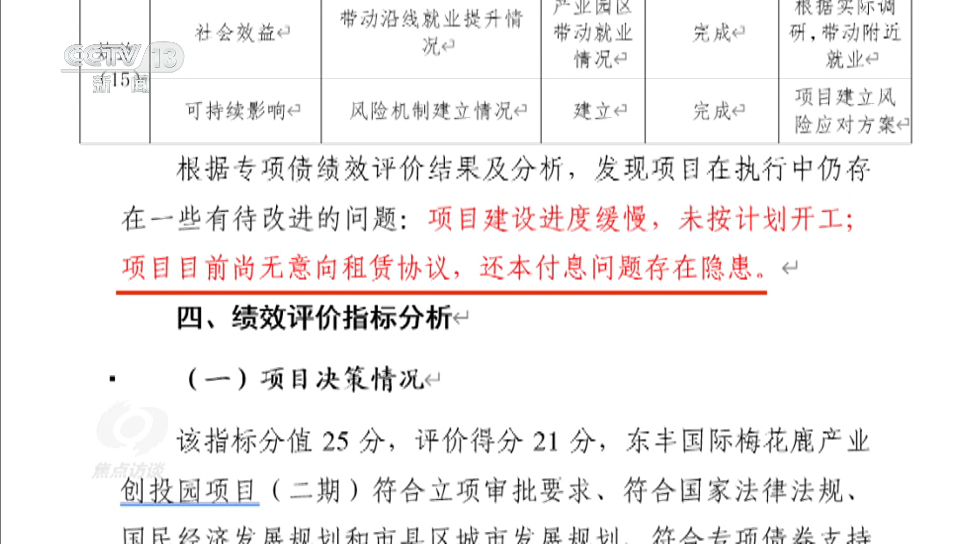吉林辽源市东丰城市发展投资(集团)有限公司董事长王鸿铭:“有评估不足的这种存在,我们充分相信了社会资本方的垫资能力,但是在建设过程当中,资金链发生了断裂,以我们县财政的财政能力我们承担不了,申请专项债还得有一定周期,所以说造成了项目有一定的延缓。”