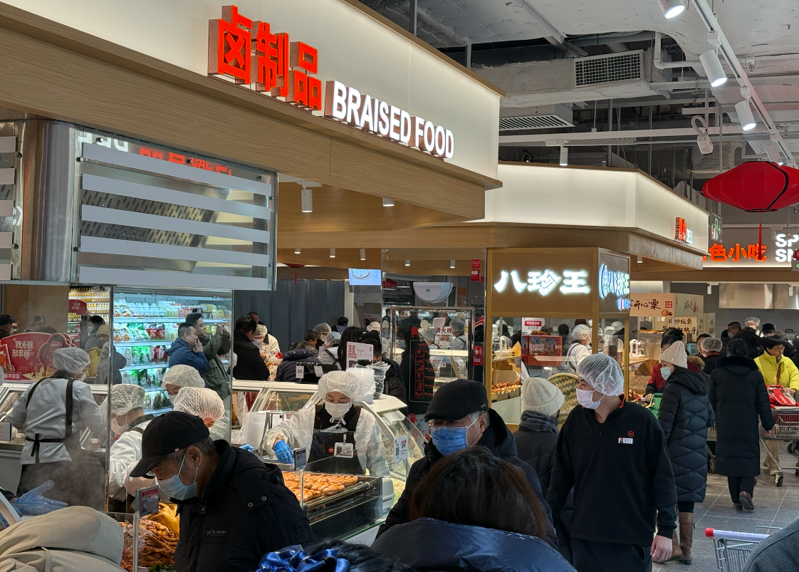 3R(即食即烹即热)板块实现深度整合。门店创新地将熟食、小吃等档口整合为“小吃一条街”,并毗邻设置就餐区。烘焙区采用环岛式陈列,面点师在内场操作,增强体验感。同时,北京稻香村、八珍王等老字号及地方特色品牌的引入,进一步丰富了即时餐饮选择,让“逛吃”成为现实。有顾客表示:“买完海鲜可以直接请师傅加工,在旁边吃完再回家,像下馆子一样方便,幸福感提升了。”