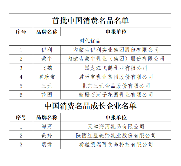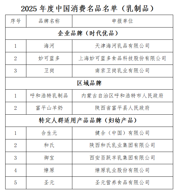 2025年4月11日, 首批中国消费名品名单(涉及乳制品行业)