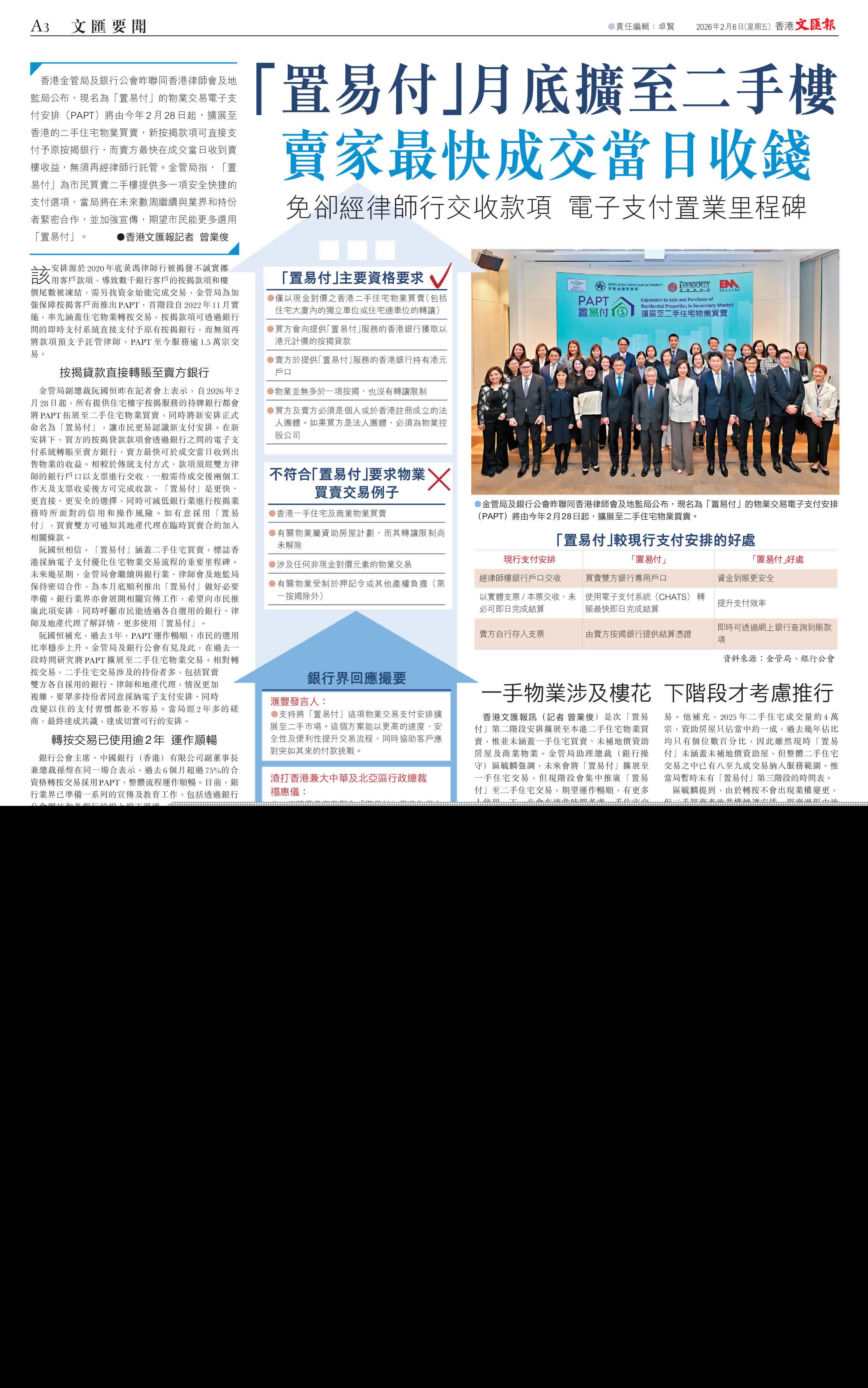 (香港文匯報記者 曾業俊)香港金管局及銀行公會昨聯同香港律師會及地監局公布,現名為「置易付」的物業交易電子支付安排(PAPT)將由今年2月28日起,擴展至香港的二手住宅物業買賣,新按揭款項可直接支付予原按揭銀行,而賣方最快在成交當日收到賣樓收益,無須再經律師行託管。金管局指,「置易付」為市民買賣二手樓提供多一項安全快捷的支付選項,當局將在未來數周繼續與業界和持份者緊密合作,並加強宣傳,期望市民能更多選用「置易付」。