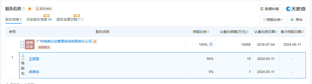 穿透股权,虹景物业目前由广州地德企业管理咨询有限公司全资控股,再往上是两位自然人股东,王翠琴、熊德武分别持股占比95%、5%。