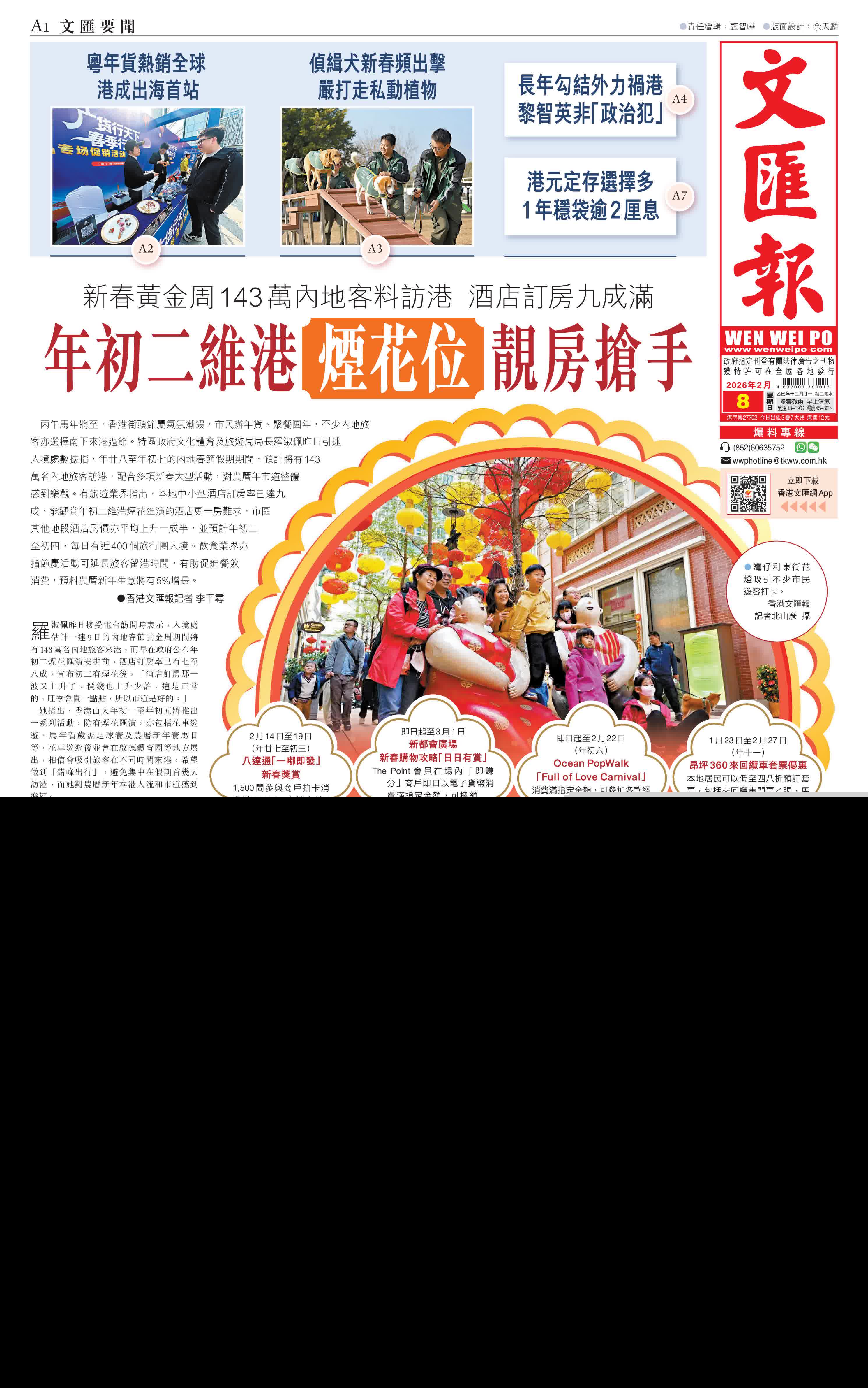 (香港文匯報記者 李千尋)丙午馬年將至,香港街頭節慶氣氛漸濃,市民辦年貨、聚餐團年,不少內地旅客亦選擇南下來港過節。特區政府文化體育及旅遊局局長羅淑佩昨日引述入境處數據指,年廿八至年初七的內地春節假期期間,預計將有143萬名內地旅客訪港,配合多項新春大型活動,對農曆年市道整體感到樂觀。有旅遊業界指出,本地中小型酒店訂房率已達九成,能觀賞年初二維港煙花匯演的酒店更一房難求,市區其他地段酒店房價亦平均上升一成半,並預計年初二至初四,每日有近400個旅行團入境。飲食業界亦指節慶活動可延長旅客留港時間,有助促進餐飲消費,預料農曆新年生意將有5%增長。